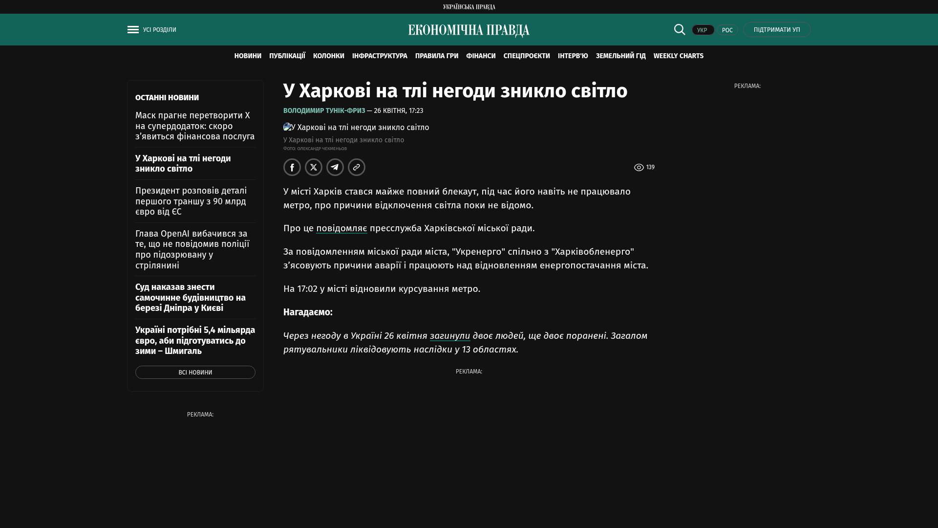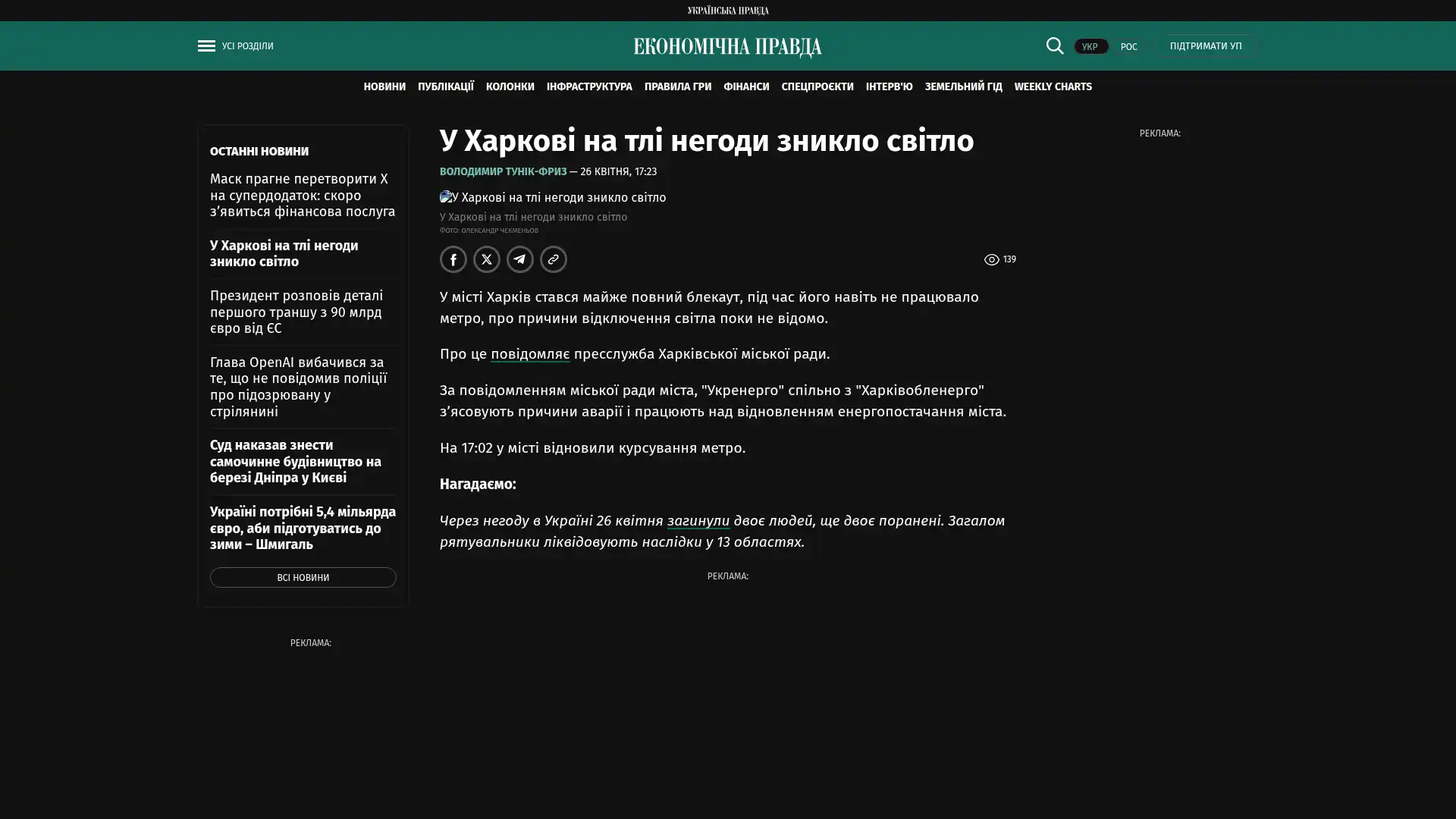 In der Stadt Charkiw kam es zu einem fast vollständigen Stromausfall, währenddessen funktionierte sogar die U-Bahn nicht; die Ursachen für den Stromausfall sind bislang noch nicht bekannt.