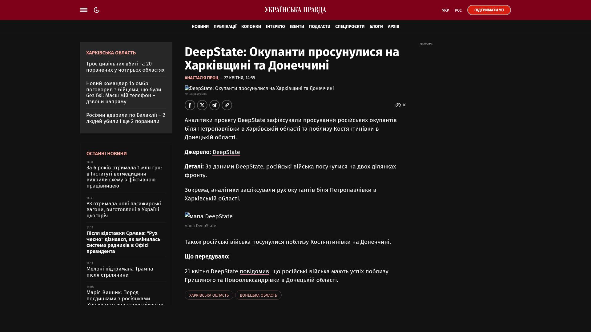 Analysten des DeepState-Projekts haben das Vorrücken russischer Invasoren bei Petropawliwka in der Region Charkiw und in der Nähe von Kostjantynivka in der Region Donezk festgestellt.
