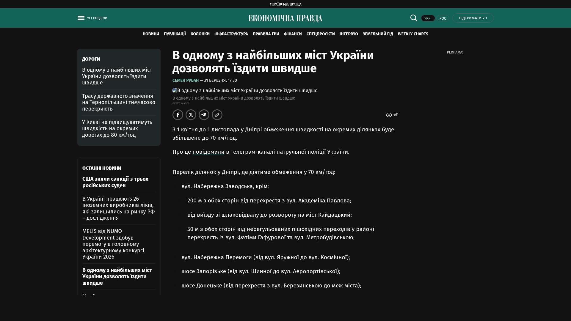 Vom 1. April bis zum 1. November wird die Geschwindigkeitsbegrenzung auf bestimmten Abschnitten in Dnipro auf 70 km/h angehoben.