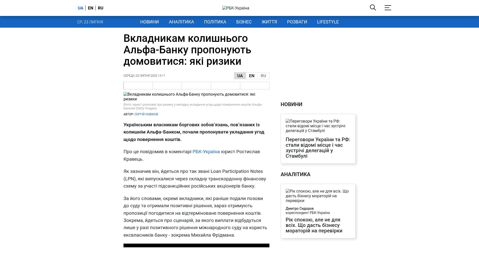 Bildschirmfoto des Originalartikels auf rbc.ua