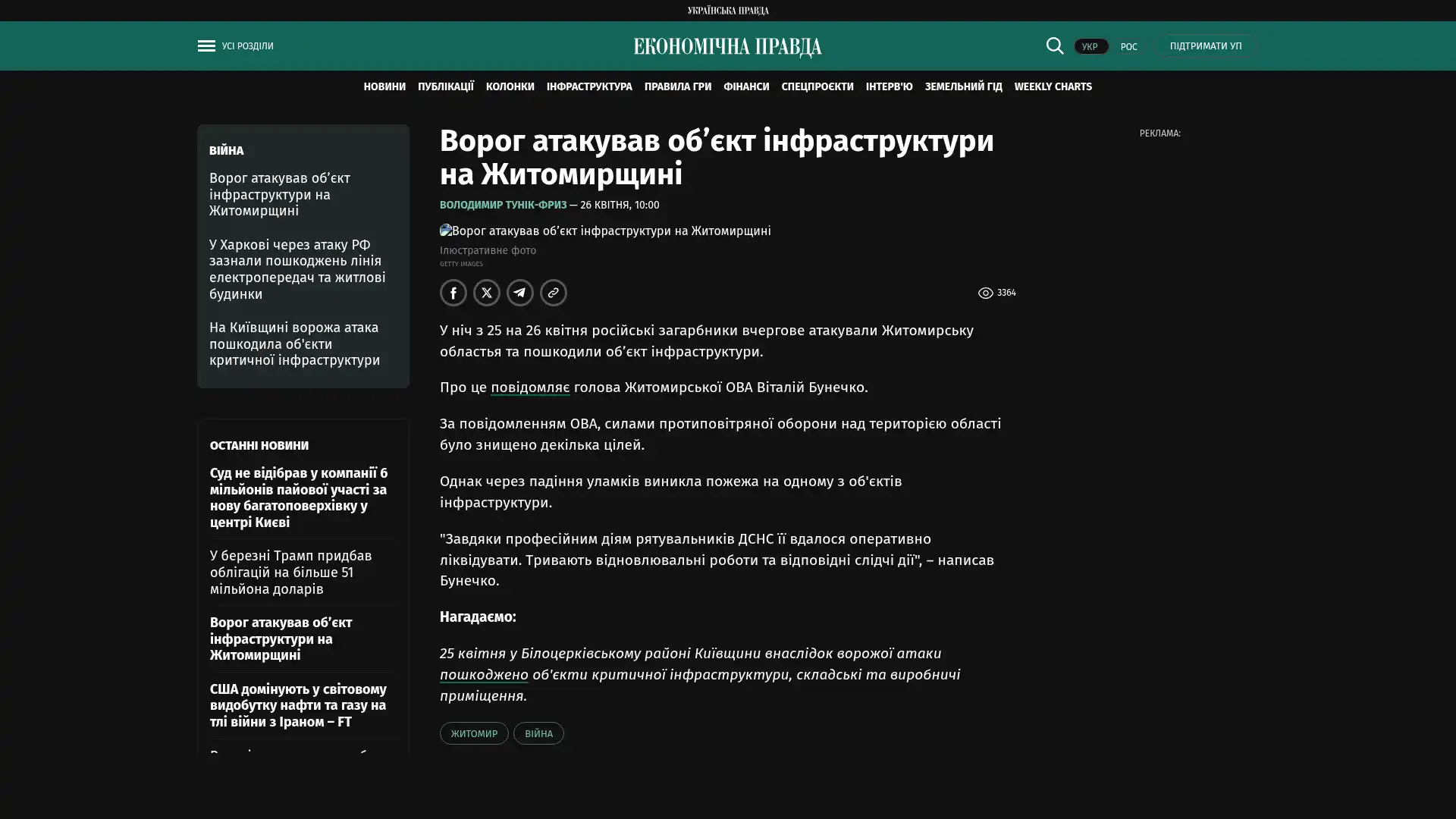 Der Feind hat eine Infrastruktureinrichtung im Gebiet Schytomyr angegriffen