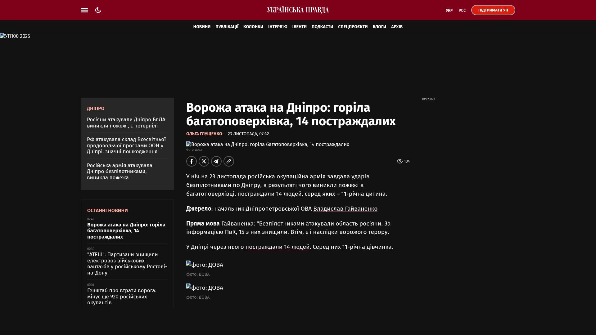 In der Nacht zum 23. November führte die russische Besatzungsarmee Drohnenangriffe in Dnipro durch, die einen Brand in einem Hochhaus verursachten, bei dem 14 Menschen, darunter ein 11-jähriges Kind, verletzt wurden.