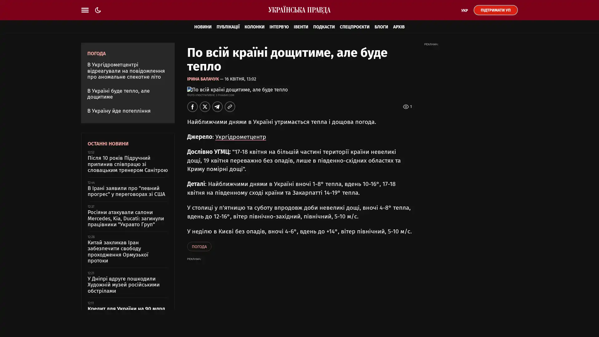 Details: : In den kommenden Tagen liegen die Temperaturen in der Ukraine nachts bei 1–8 °C, tagsüber bei 10–16 °C; am 17. und 18. April im Südosten des Landes und in Transkarpatien bei 14–19 °C.