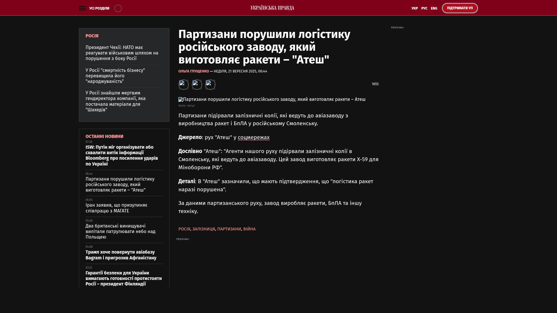 Atesh sagte*:* „Agenten unserer Bewegung haben die Eisenbahnschienen in Smolensk gesprengt, die zu einer Flugzeugfabrik führen. In diesem Werk werden Ch-59-Raketen für das russische Verteidigungsministerium hergestellt.“