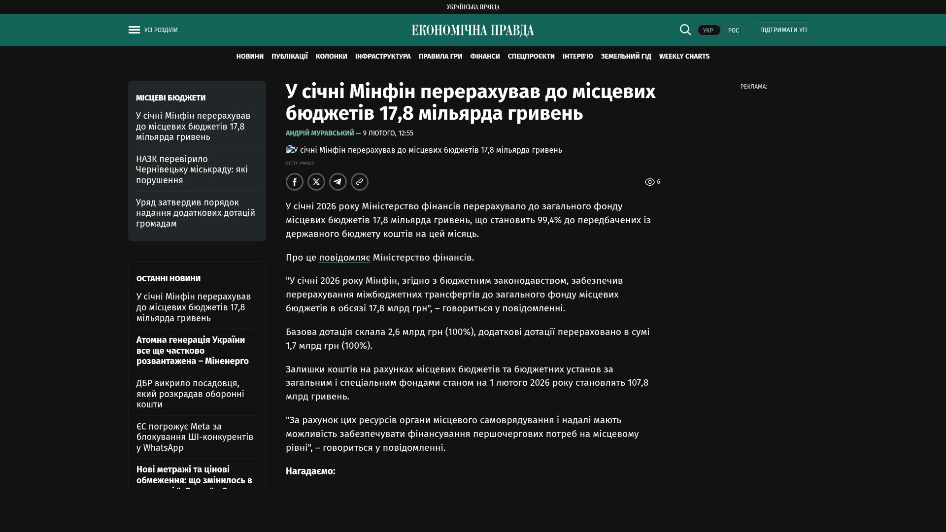 Im Januar 2026 überwies das Finanzministerium 17,8 Milliarden Hrywnja an den allgemeinen Fonds der lokalen Haushalte, was 99,4 % der für diesen Monat im Staatshaushalt vorgesehenen Mittel entspricht.