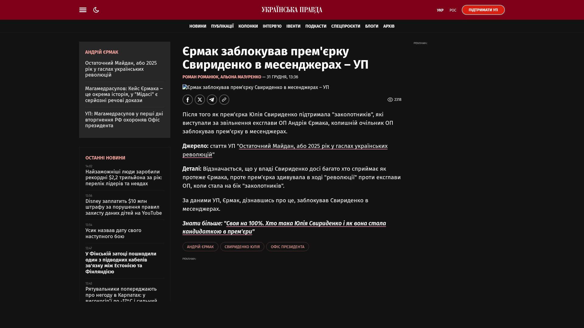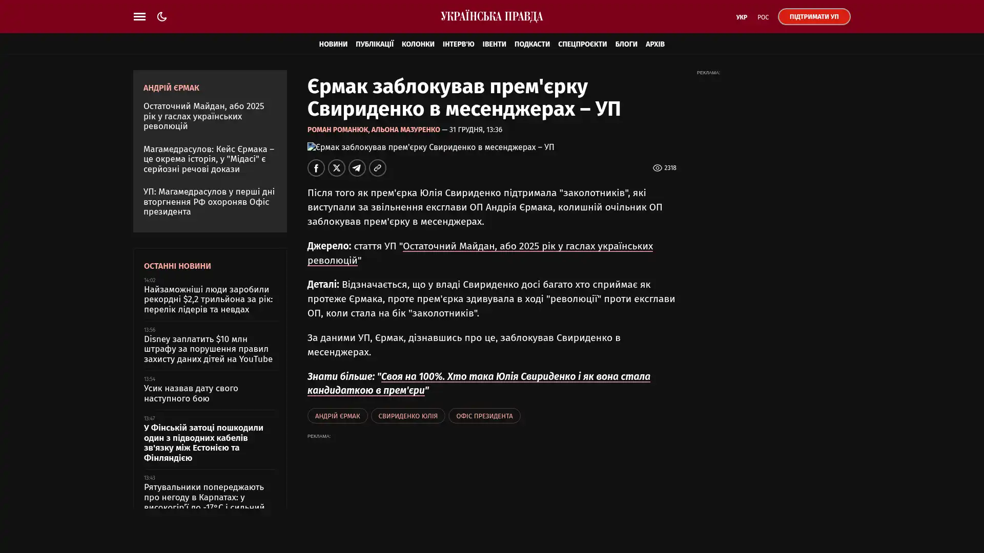 Nach Angaben der Ukrajinska Prawda blockierte Jermak Swyrydenko in seinen Boten, als er davon erfuhr.