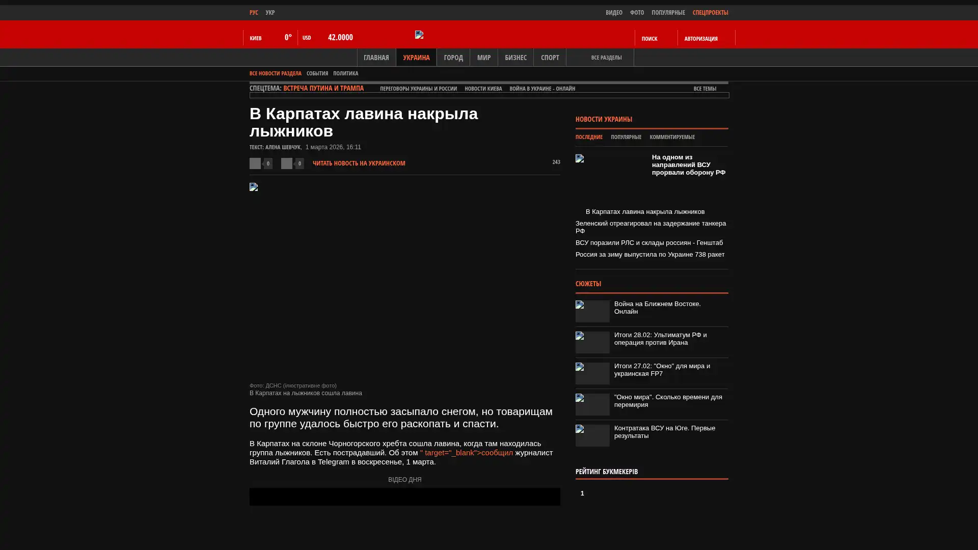 In den Karpaten kam es auf dem Hang des Tschornogora-Gebirges zu einer Lawine, als sich dort eine Gruppe von Skifahrern befand. Es gibt einen Verletzten. Dies berichtete der Journalist Witalij Glagola am Sonntag, dem 1. März, auf Telegram.