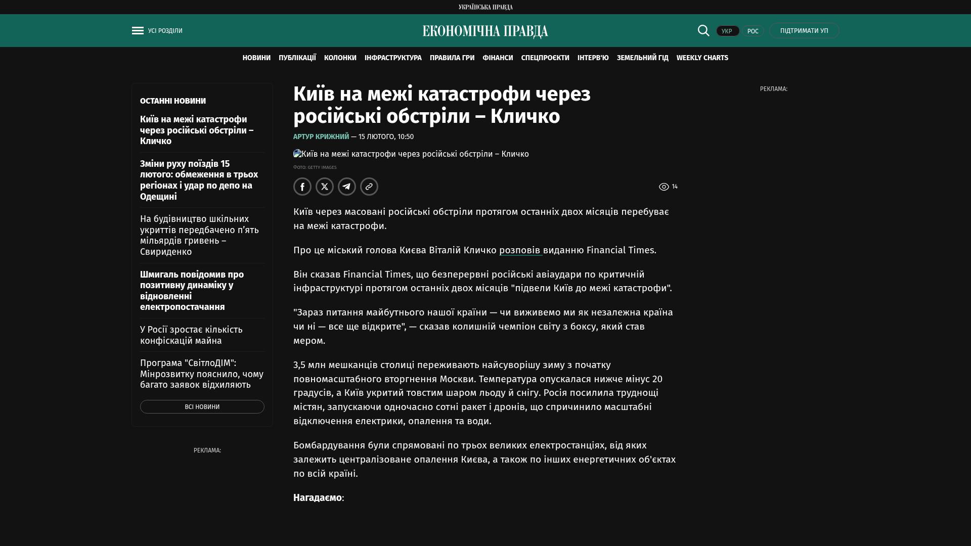Dies erklärte der Bürgermeister von Kiew, Witalij Klitschko, gegenüber der Financial Times.