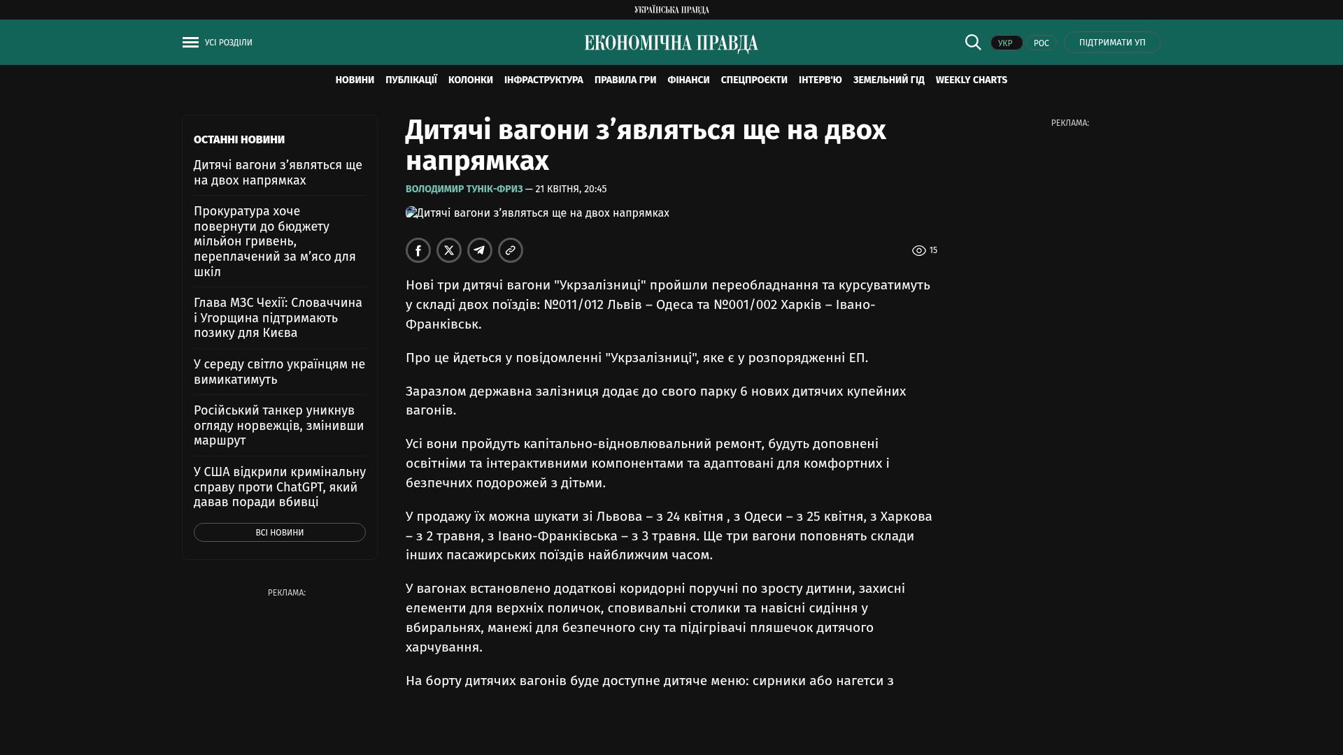 Sie sind ab dem 24. April ab Lemberg, ab dem 25. April ab Odessa, ab dem 2. Mai ab Charkiw und ab dem 3. Mai ab Iwano-Frankiwsk erhältlich. Drei weitere Wagen werden in Kürze den Bestand anderer Personenzüge ergänzen.