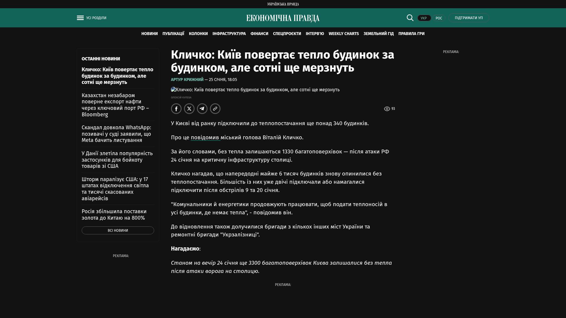 Klitschko erinnerte daran, dass am Tag zuvor fast 6.000 Gebäude erneut ohne Wärmeversorgung waren. Die meisten von ihnen wurden nach dem Beschuss am 9. und 20. Januar bereits wieder angeschlossen oder es wurde zweimal versucht, sie wieder anzuschließen.