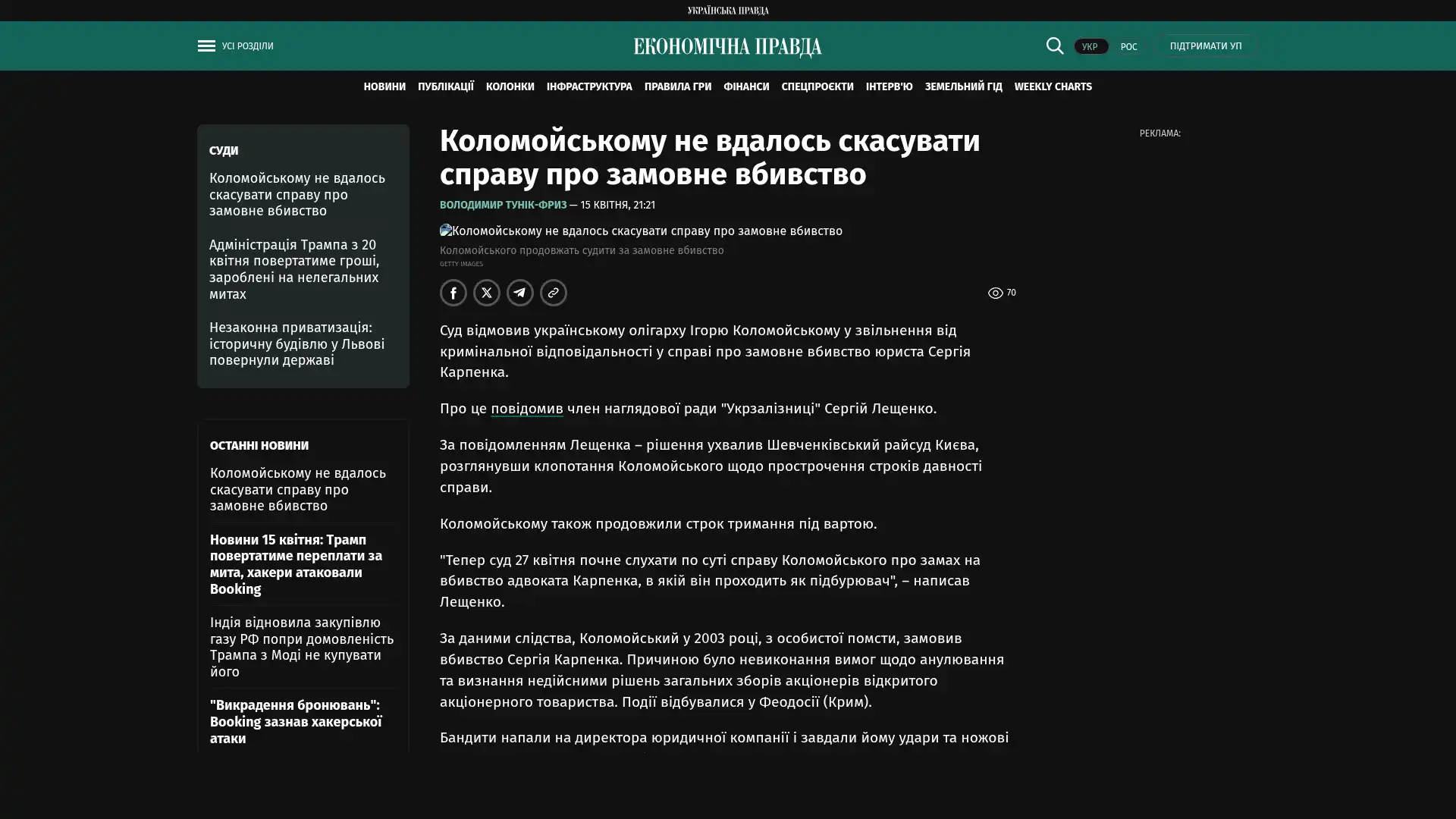 Das Gericht lehnte den Antrag des ukrainischen Oligarchen Ihor Kolomojskyj auf Befreiung von der strafrechtlichen Verantwortung im Fall des Auftragsmords an dem Juristen Serhij Karpenko ab.