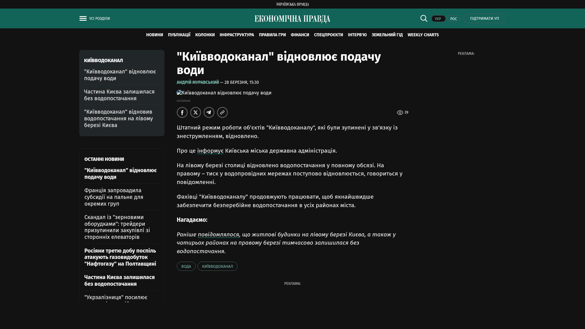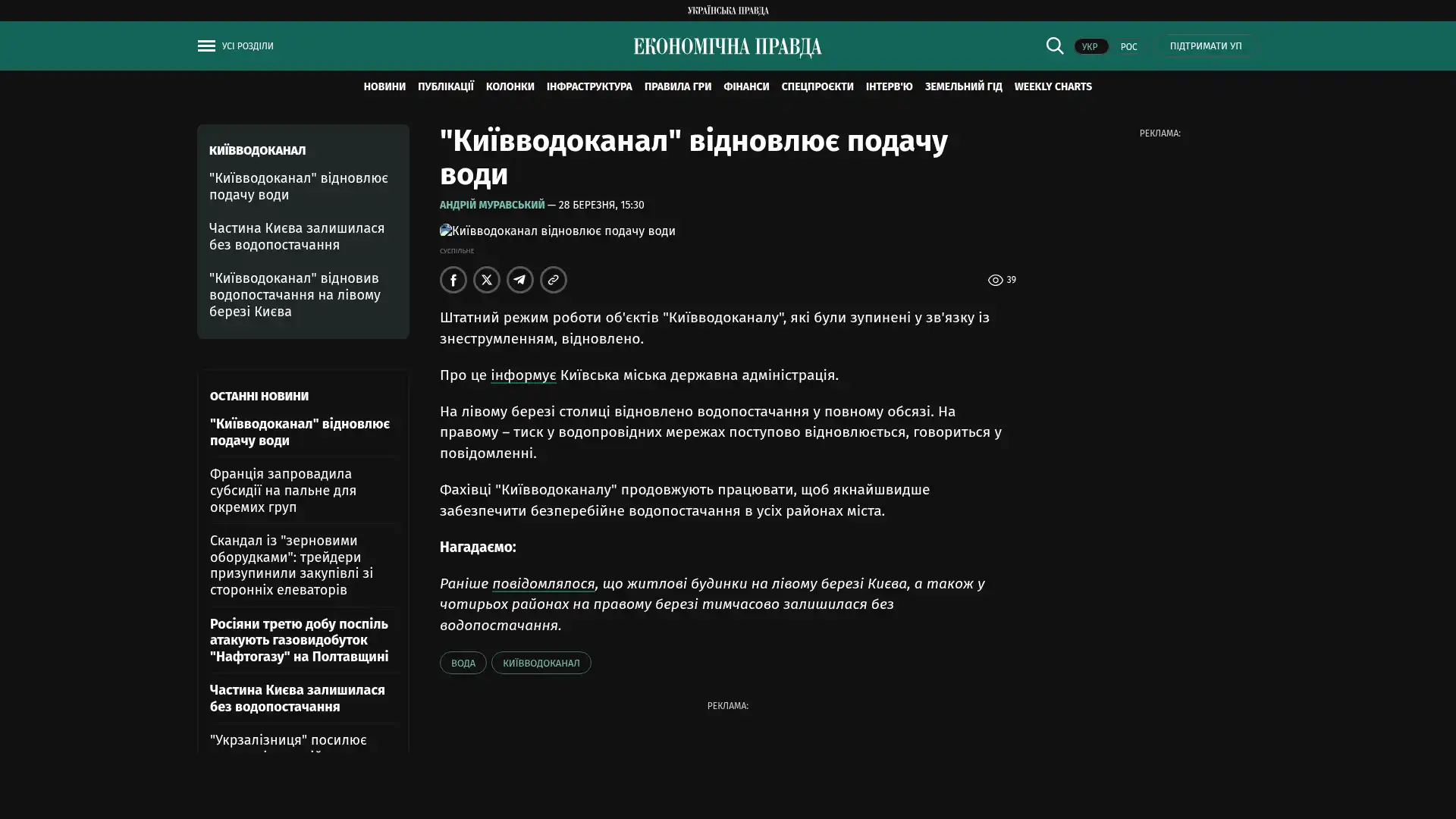 Der reguläre Betrieb der Anlagen von „Kyjiwvodokanal“, die aufgrund eines Stromausfalls stillgelegt waren, wurde wieder aufgenommen.