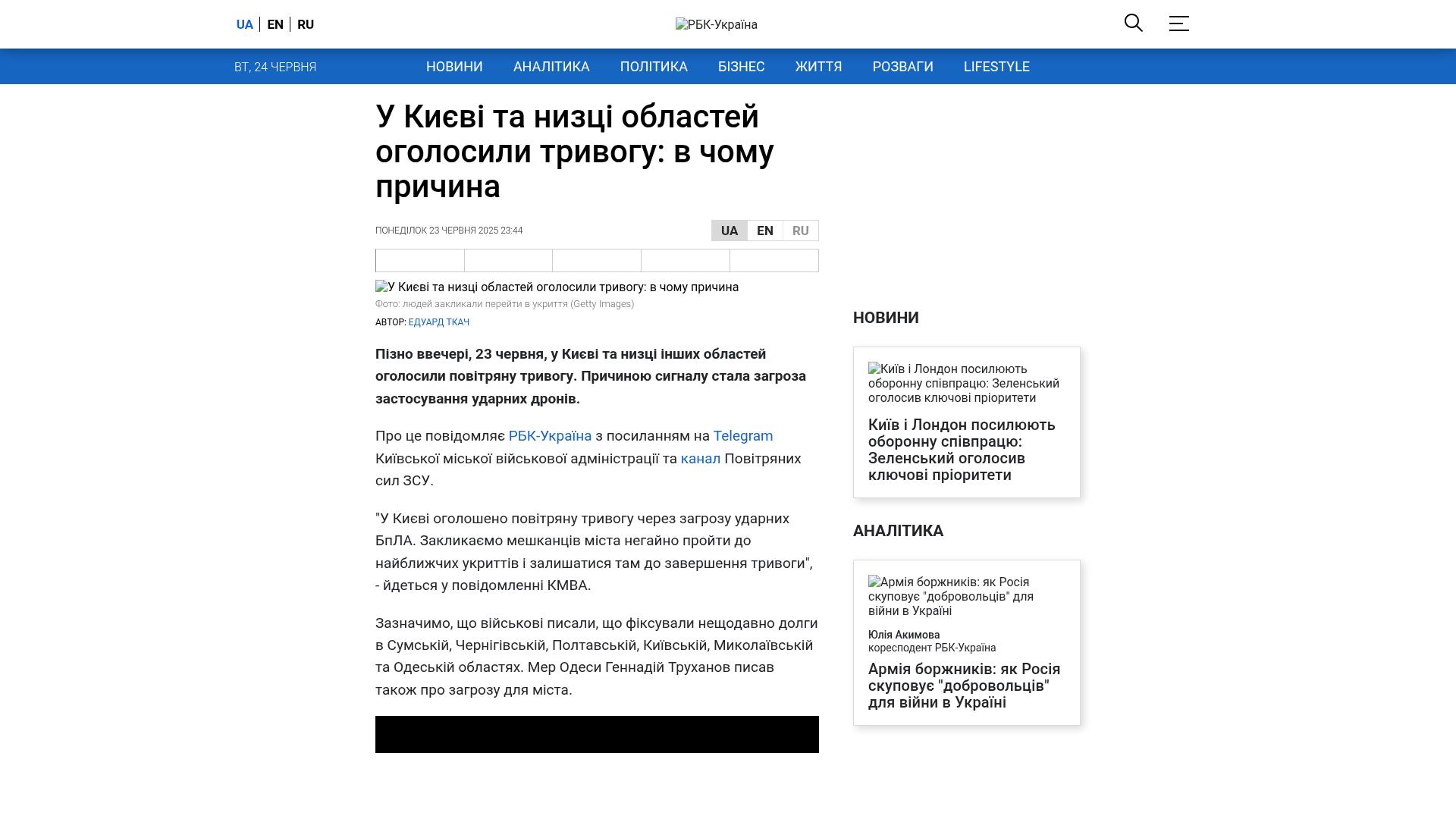 Am späten Abend des 23. Juni wurde in Kiew und einigen anderen Regionen ein Luftalarm ausgerufen. Der Grund für das Signal war die Bedrohung durch den Einsatz von Kampfdrohnen.