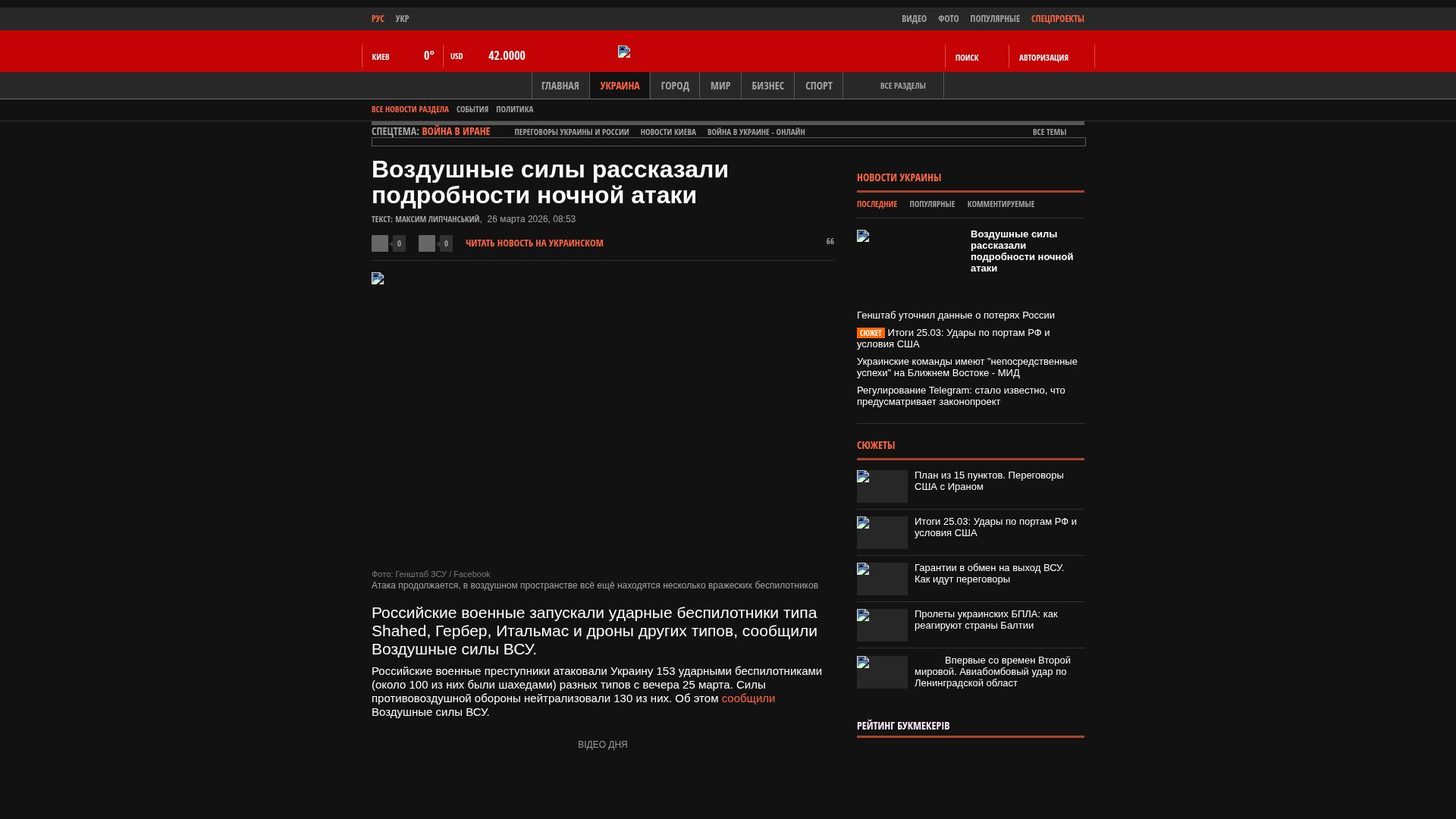 Russische Kriegsverbrecher griffen die Ukraine seit dem Abend des 25. März mit 153 Angriffsdrohnen (davon etwa 100 vom Typ Schahed) verschiedener Typen an. Die Luftabwehr neutralisierte 130 davon. Dies teilte die Luftwaffe der Streitkräfte der Ukraine mit.