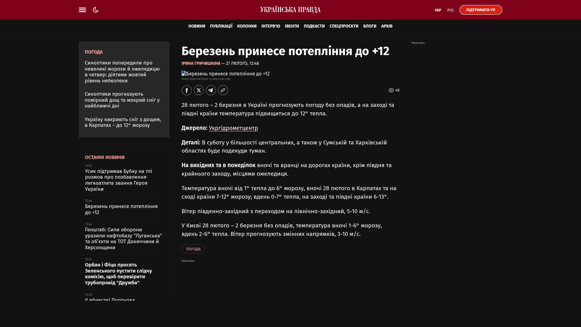 Vom 28. Februar bis zum 2. März wird in der Ukraine trockenes Wetter vorhergesagt, im Westen und Süden des Landes steigen die Temperaturen auf bis zu 12 °C.