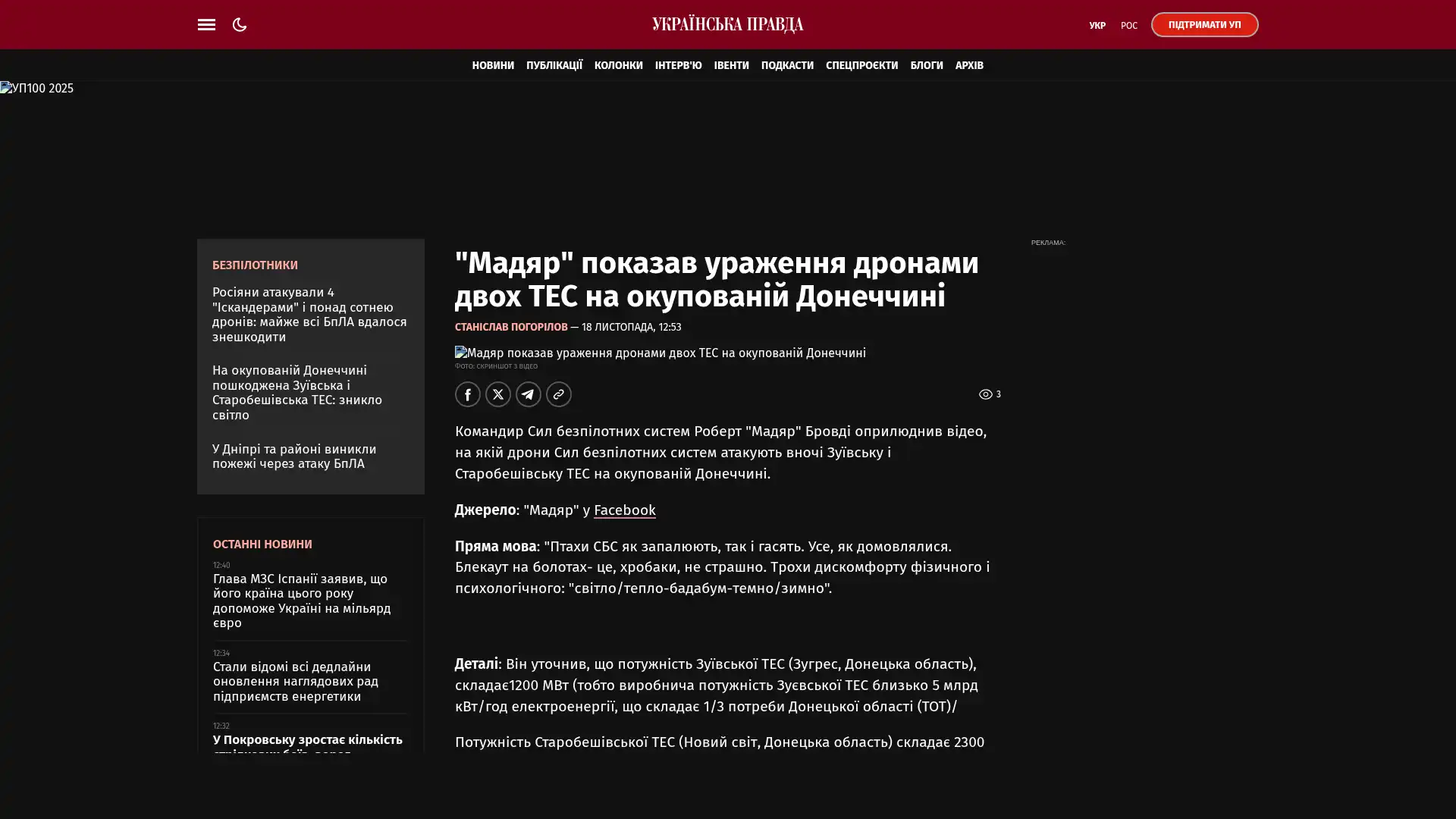 Der Kommandeur der Unmanned Systems Forces, Robert „Magyar“ Brovdi, veröffentlichte ein Video von Drohnenangriffen auf die Wärmekraftwerke Zuiv und Starobeshevo in der besetzten Region Donezk bei Nacht.