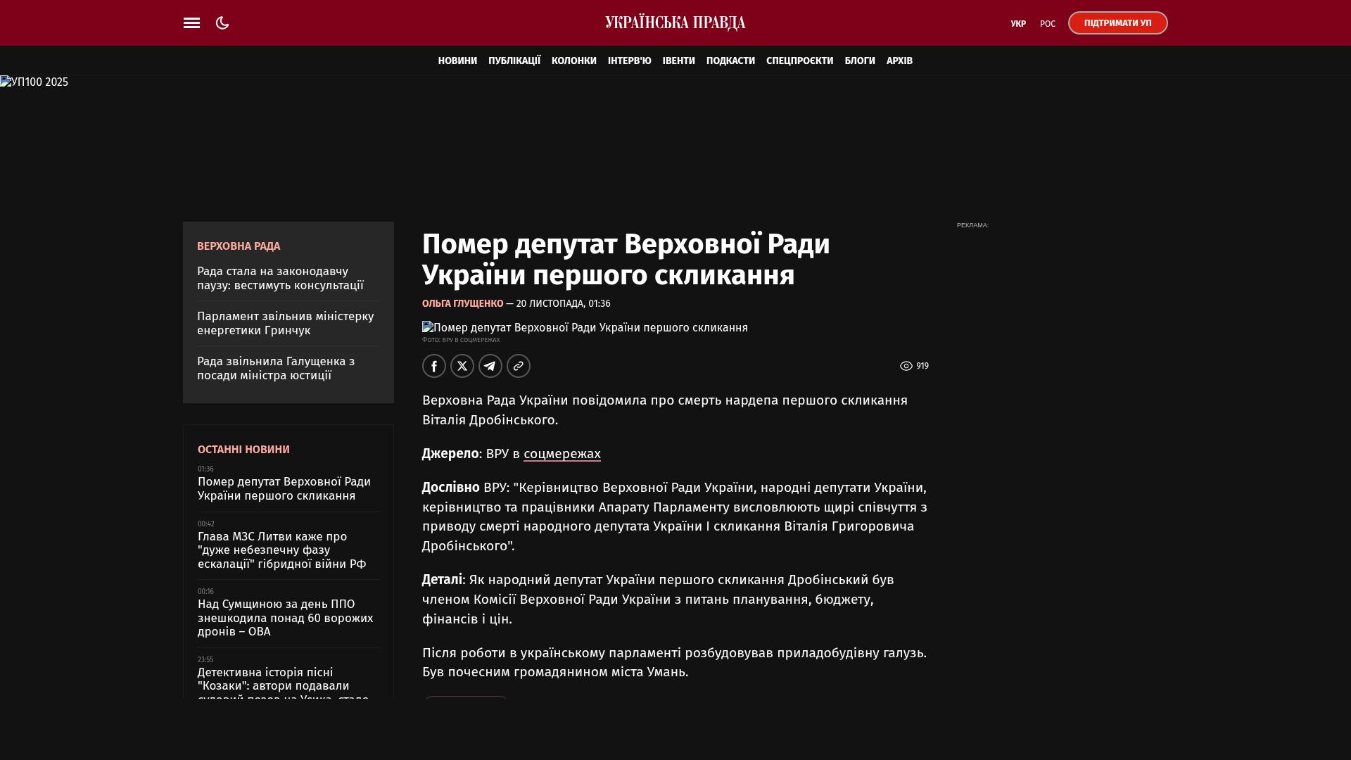 Die Werchowna Rada der Ukraine hat den Tod von Witalij Drobinsky, einem Mitglied der ersten Einberufung der Werchowna Rada, bekannt gegeben.