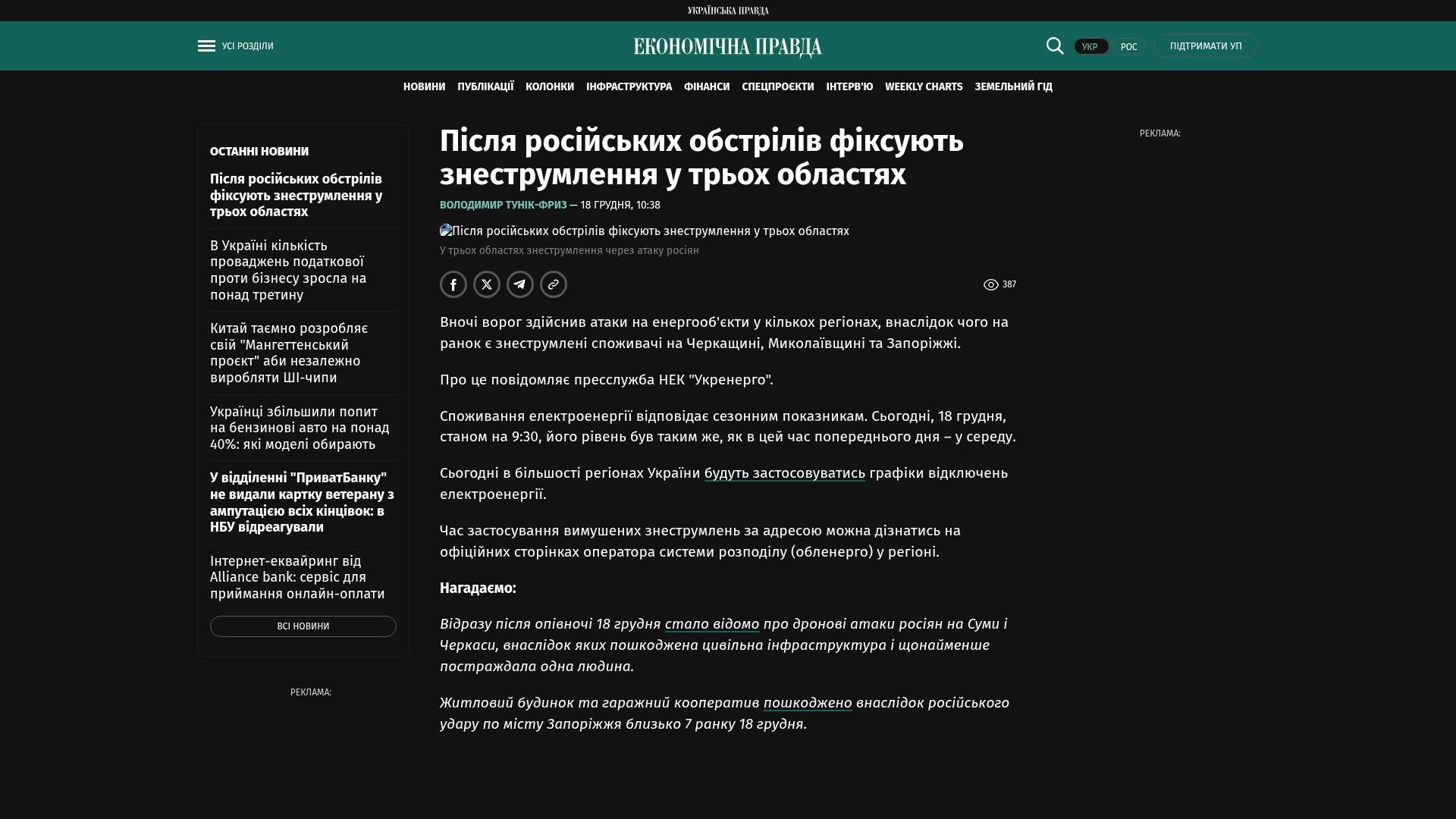 Kurz nach Mitternacht am 18. Dezember wurde bekannt, dass die Russen Drohnenangriffe auf Sumy und Tscherkassy durchgeführt haben, bei denen zivile Infrastruktur beschädigt und mindestens eine Person verletzt wurde.