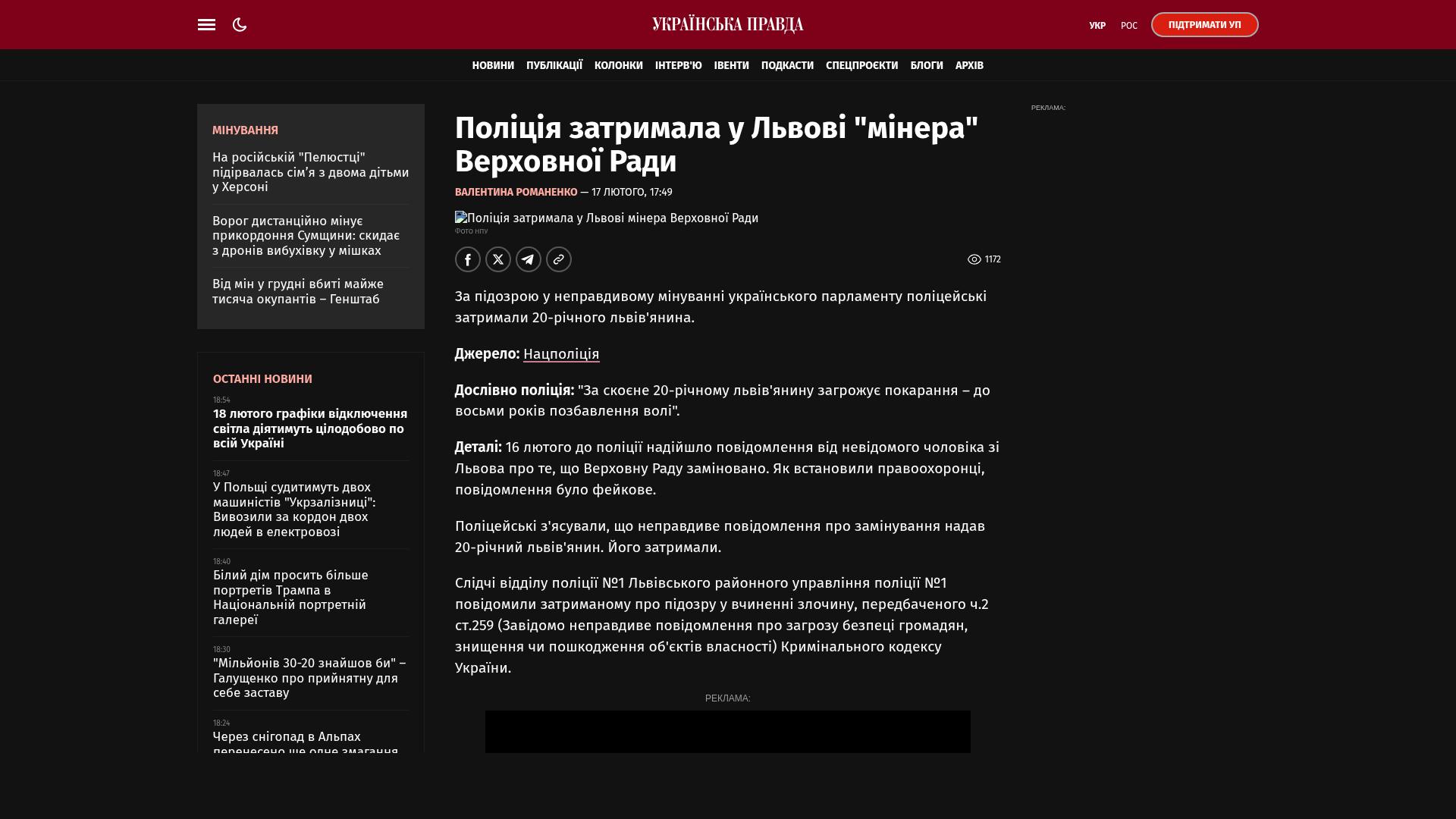 Die Ermittler der Polizeidienststelle Nr. 1 der Bezirkspolizeidirektion Nr. 1 in Lemberg teilten dem Festgenommenen mit, dass er der Begehung einer Straftat gemäß Art. 259 Abs. 2 (wissentlich falsche Meldung über eine Gefahr für die Sicherheit der Bürger, Zerstörung oder Beschädigung von Eigentum) des Strafgesetzbuches der Ukraine verdächtigt wird.