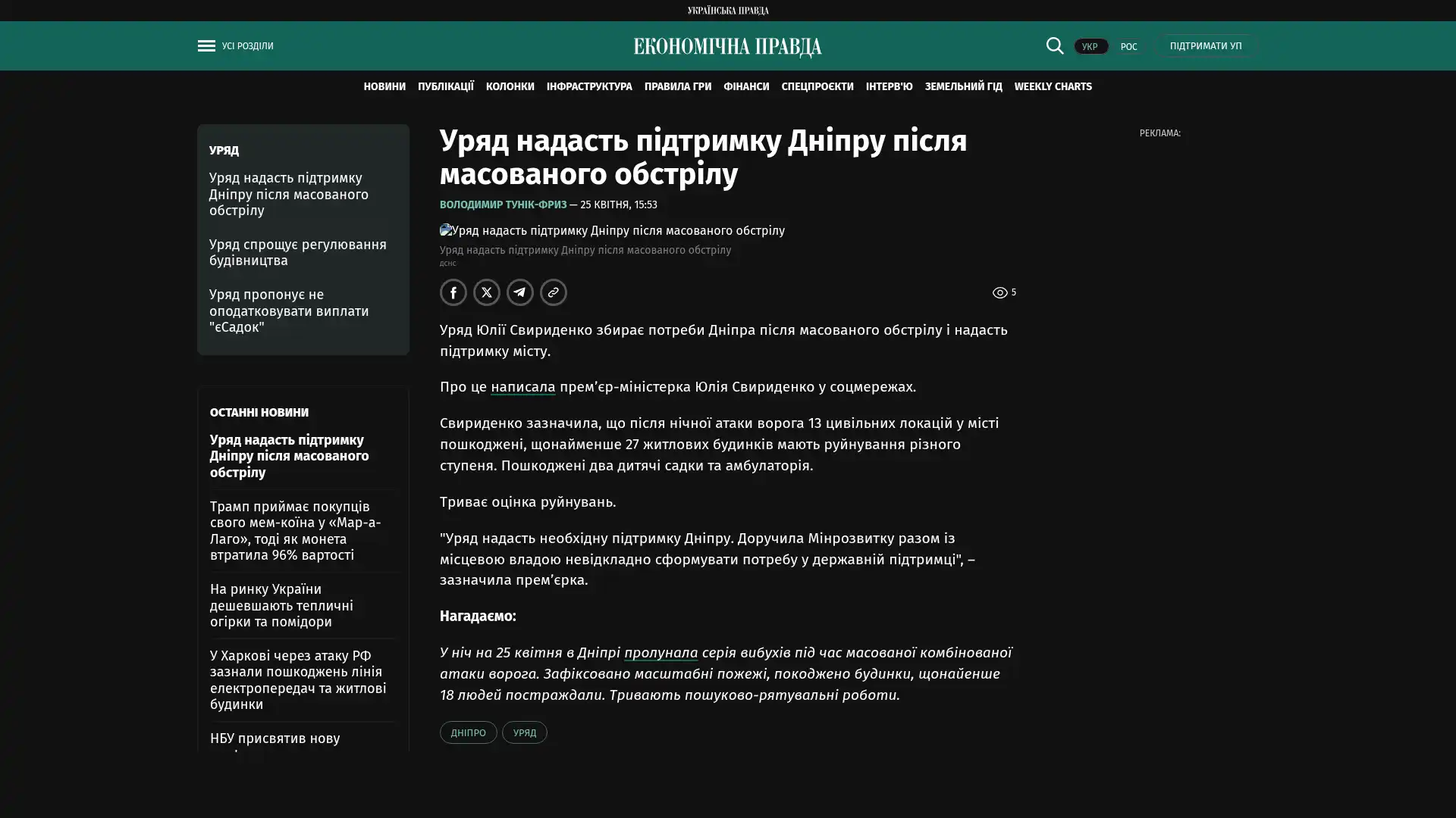 Die Regierung unter Julija Swyrydenko erfasst den Bedarf in Dnipro nach dem massiven Beschuss und wird der Stadt Unterstützung gewähren.