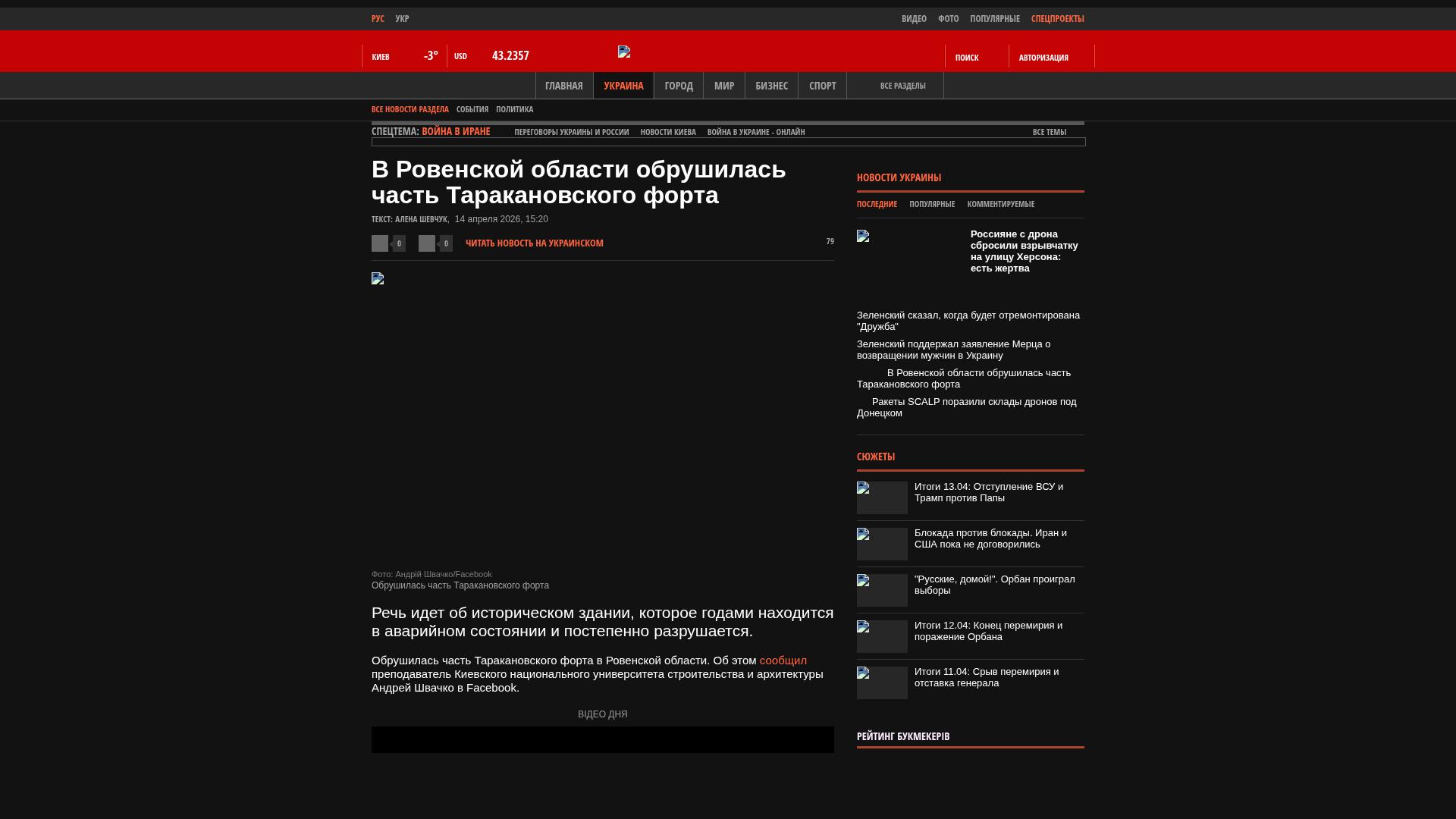 Ein Teil des Tarakanow-Forts in der Region Riwne ist eingestürzt. Dies teilte Andrej Schwatscho, Dozent an der Nationalen Universität für Bauwesen und Architektur in Kiew, auf Facebook mit.