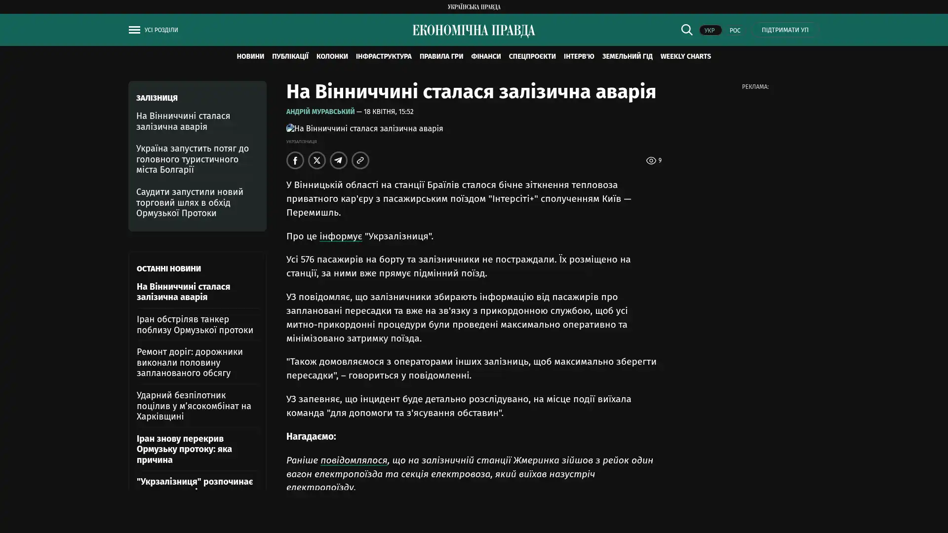 Im Bezirk Winnyzja kam es am Bahnhof Brailiv zu einer seitlichen Kollision zwischen einer Lokomotive eines privaten Steinbruchs und dem Personenzug „Intercity+“ auf der Strecke Kiew – Przemyśl.