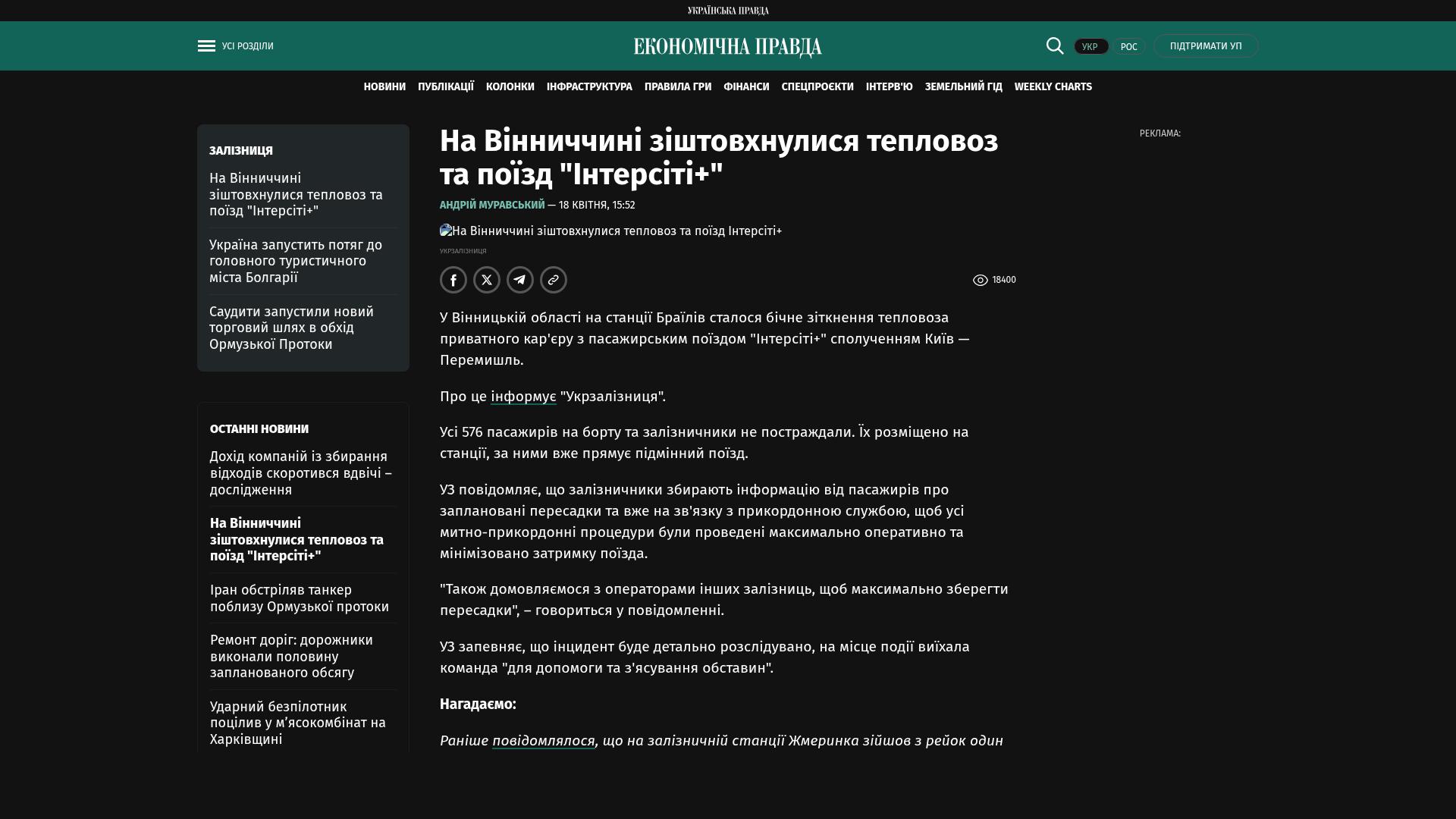 Im Gebiet Winnyzja kam es am Bahnhof Brailiv zu einer seitlichen Kollision zwischen einer Lokomotive eines privaten Steinbruchs und dem Personenzug „Intercity+“ auf der Strecke Kiew – Przemyśl.