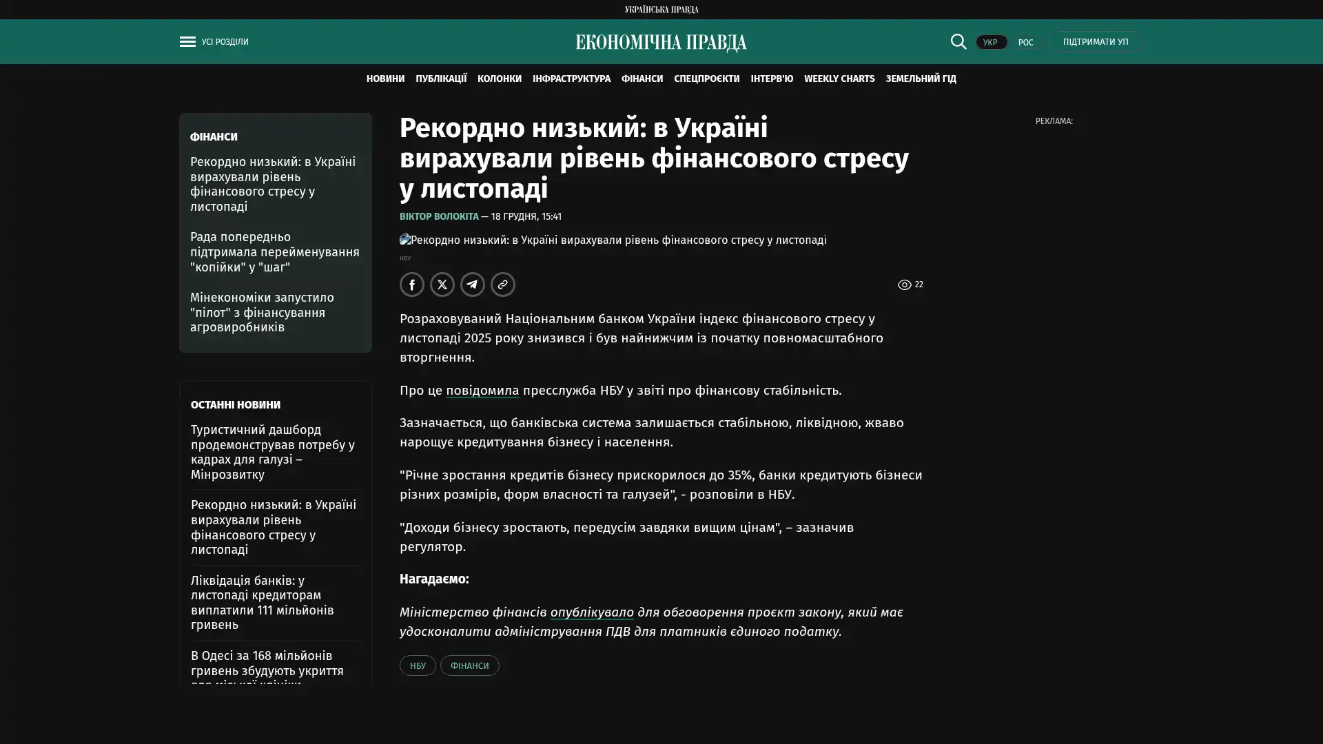 Im November 2025 ist der von der Nationalbank der Ukraine berechnete Finanzstressindex gesunken und hat den niedrigsten Stand seit Beginn der umfassenden Invasion erreicht.