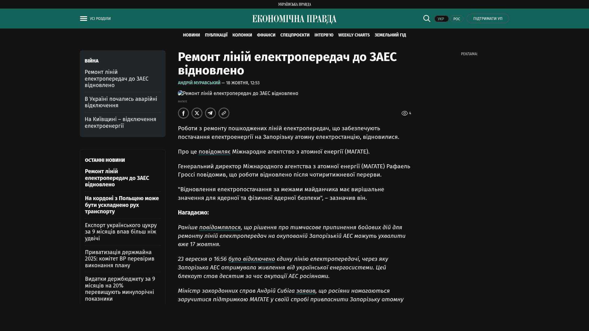 Die Reparatur der beschädigten Stromleitungen, die das Kernkraftwerk Saporischschja mit Strom versorgen, wurde wieder aufgenommen.