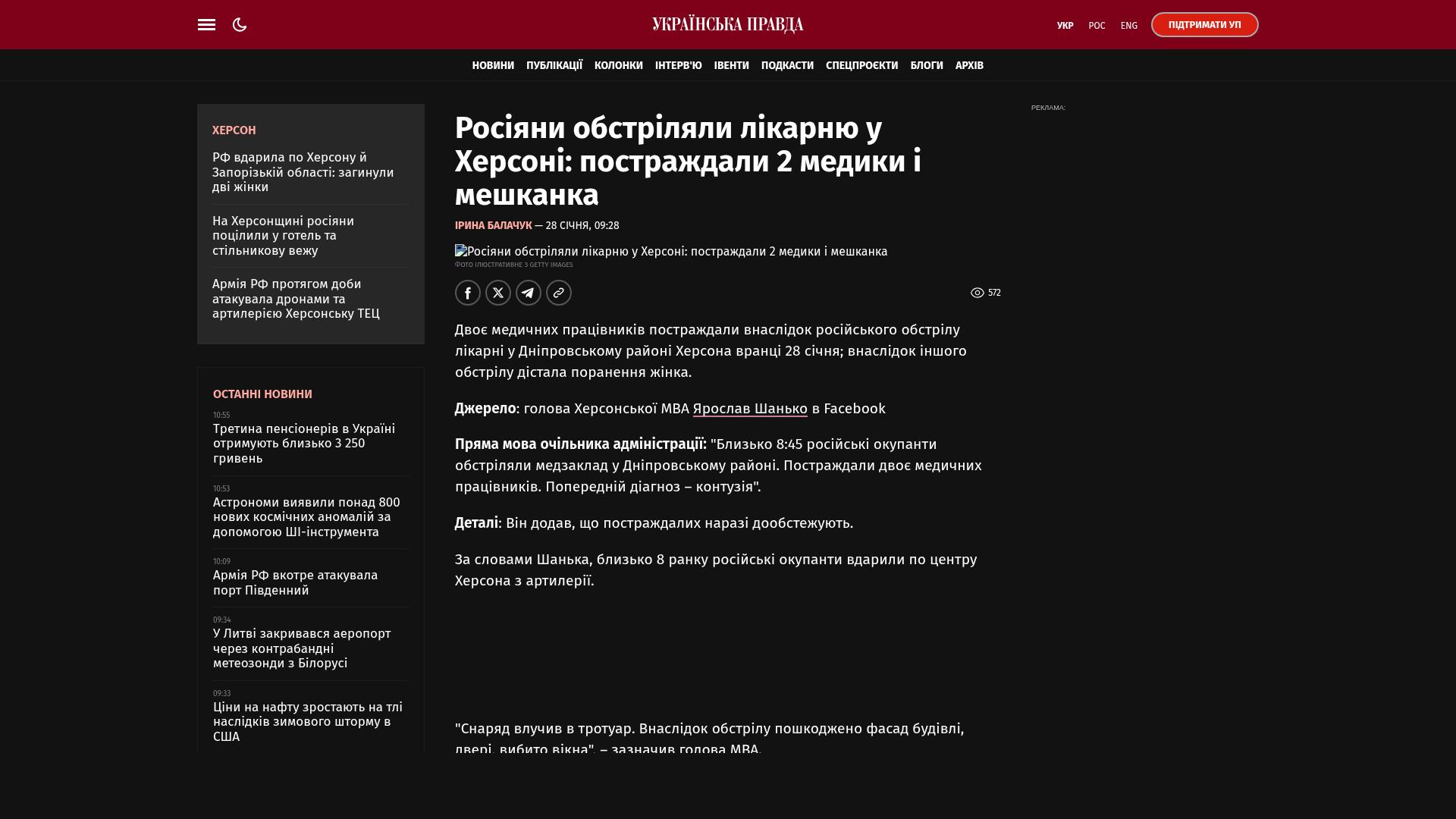In Cherson wurden zwei Ärzte durch den russischen Beschuss eines Krankenhauses verletzt, bei ihnen wurde eine Gehirnerschütterung diagnostiziert.