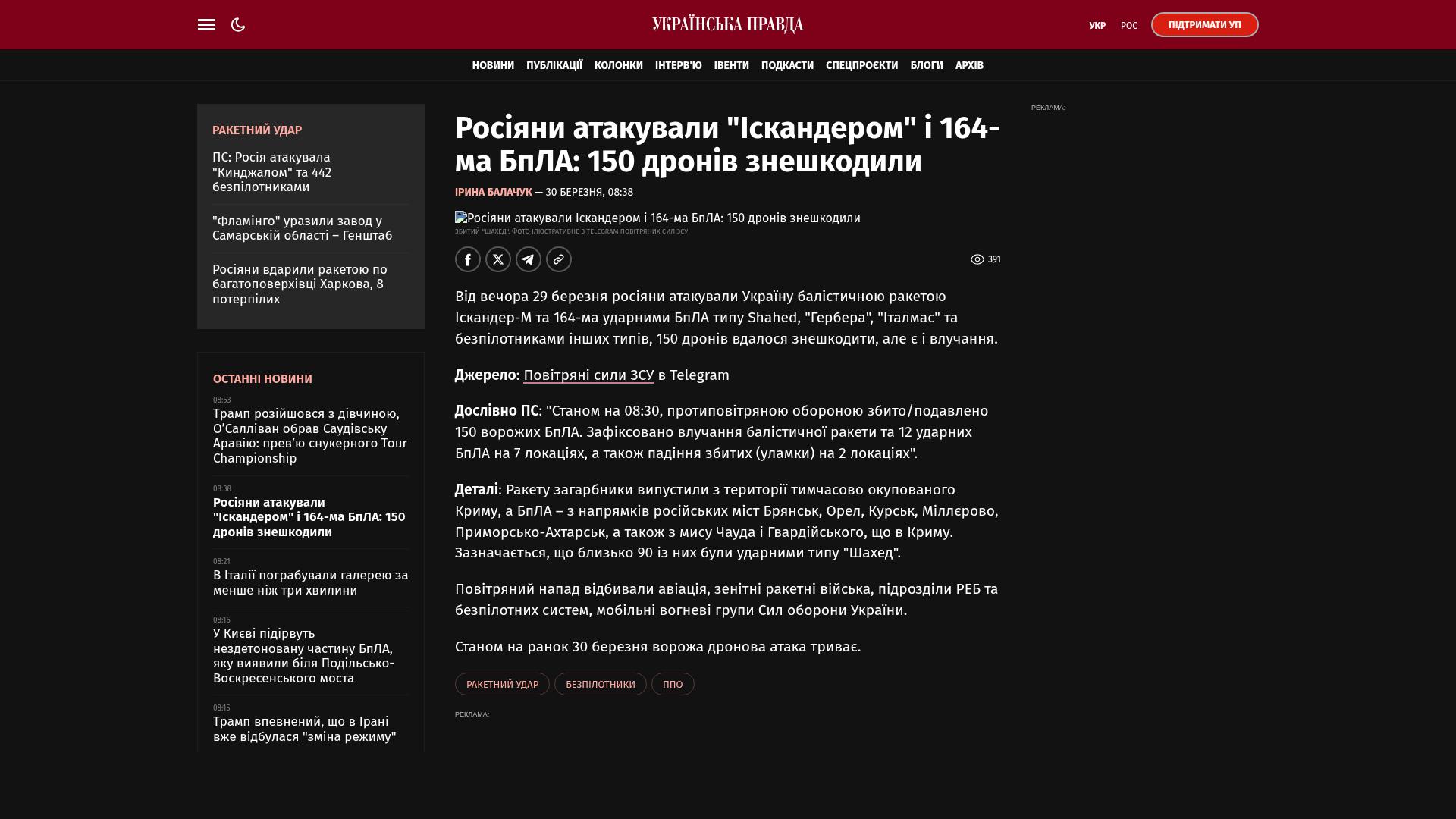 Seit dem Abend des 29. März griffen die Russen die Ukraine mit einer Iskander-M-Rakete sowie 164 Angriffsdrohnen der Typen Schahed, „Gerbera“, „Italmas“ und anderen Drohnentypen an; 150 Drohnen konnten abgeschossen werden, es gab jedoch auch Treffer.