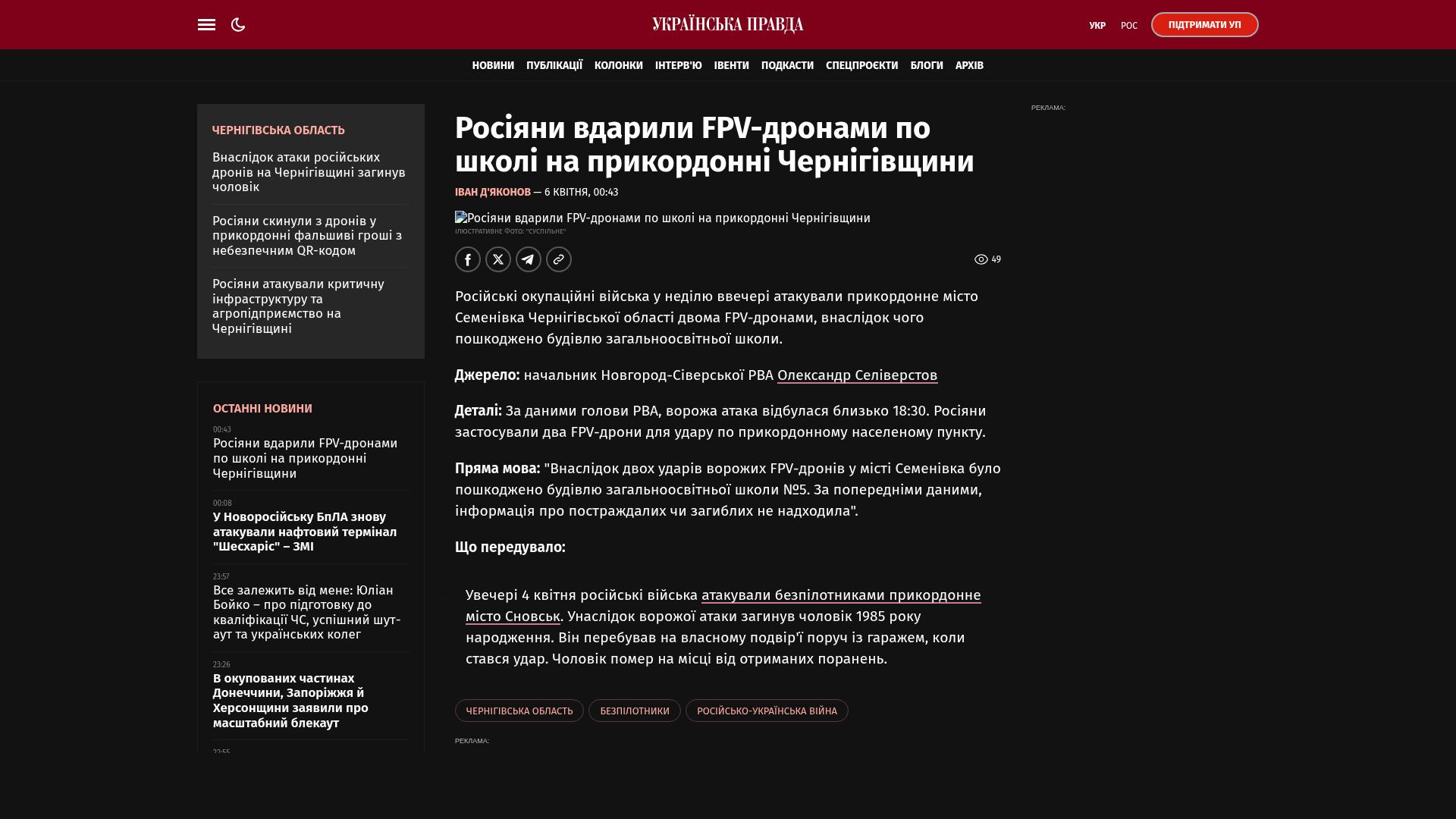 Russische Besatzungstruppen haben am Sonntagabend die Grenzstadt Semenivka in der Region Tschernihiw mit zwei FPV-Drohnen angegriffen, wodurch das Gebäude einer allgemeinbildenden Schule beschädigt wurde.