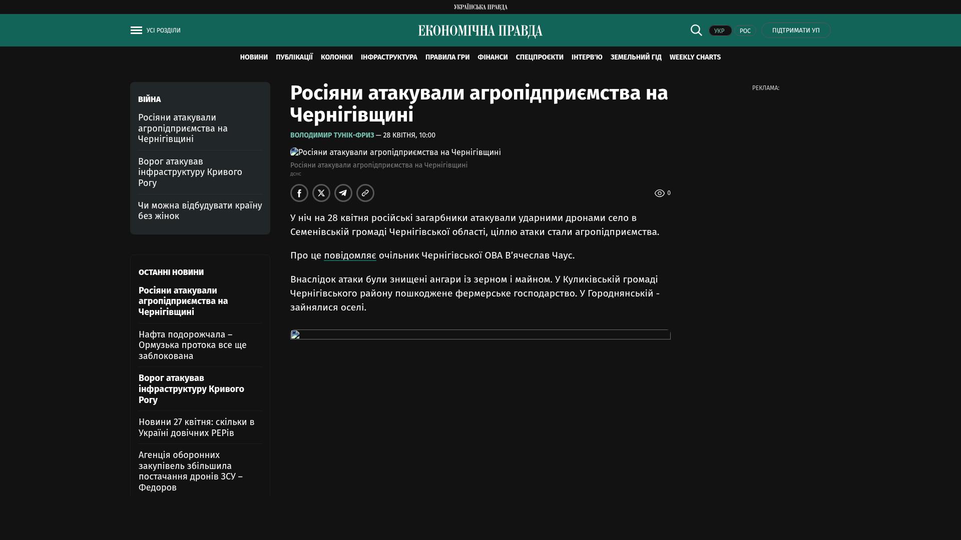 In der Nacht zum 28. April griffen russische Invasoren mit Kampfdrohnen ein Dorf in der Gemeinde Semenivka im Gebiet Tschernihiw an; Ziel des Angriffs waren landwirtschaftliche Betriebe.