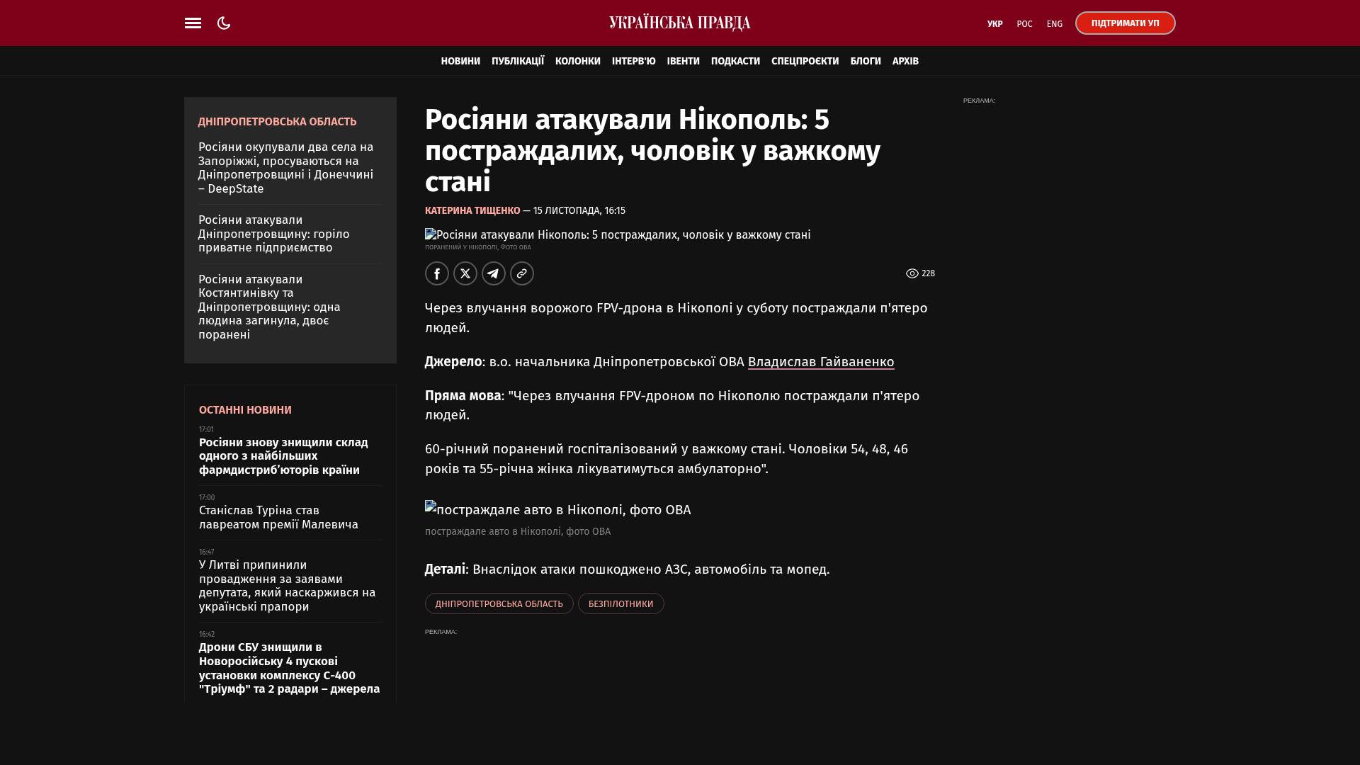 Eine feindliche FPV-Drohne schlug am Samstag in Nikopol ein und verletzte fünf Menschen.