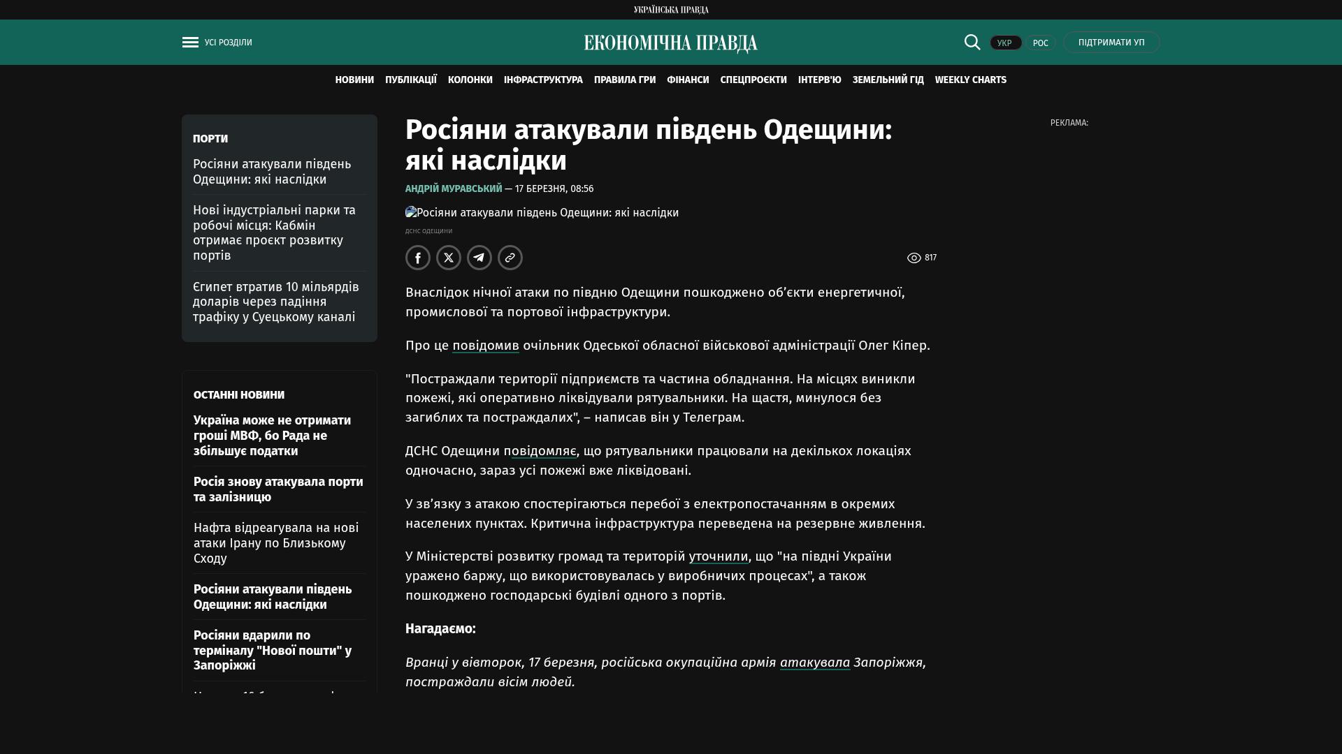 Das Ministerium für die Entwicklung von Gemeinden und Gebieten präzisierte, dass „im Süden der Ukraine ein Lastkahn getroffen wurde, der in Produktionsprozessen eingesetzt wurde“, sowie Wirtschaftsgebäude eines der Häfen beschädigt wurden.