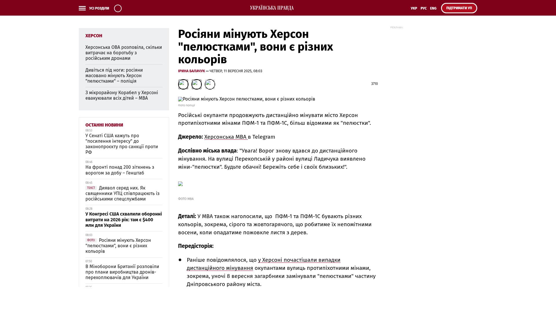 - Zuvor wurde berichtet, dass die Invasoren in Cherson immer häufiger Straßen mit Antipersonenminen verminen. Insbesondere in der Nacht vom 8. September verminten die Invasoren einen Teil des Stadtteils Dnipro mit „Blütenblättern“.
