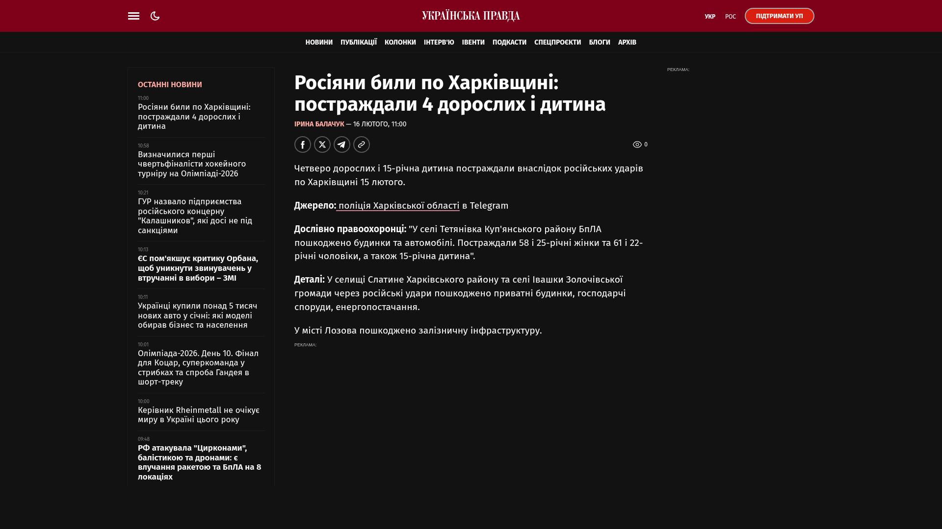 Wörtliches Zitat der Strafverfolgungsbehörden: „Im Dorf Tetyanivka im Bezirk Kupjansk wurden durch Drohnenangriffe Häuser und Autos beschädigt. Es wurden eine 58-jährige und eine 25-jährige Frau, ein 61-jähriger und ein 22-jähriger Mann sowie ein 15-jähriges Kind verletzt.“