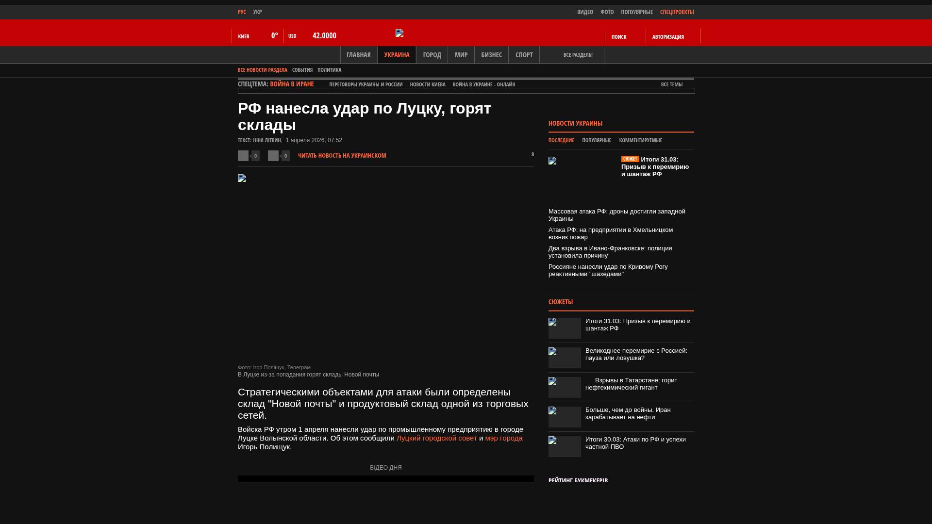 Am Morgen des 1. April haben russische Truppen einen Angriff auf ein Industrieunternehmen in der Stadt Luzk in der Oblast Wolhynien durchgeführt. Dies teilten der Stadtrat von Luzk und der Bürgermeister der Stadt, Ihor Polischtschuk, mit.