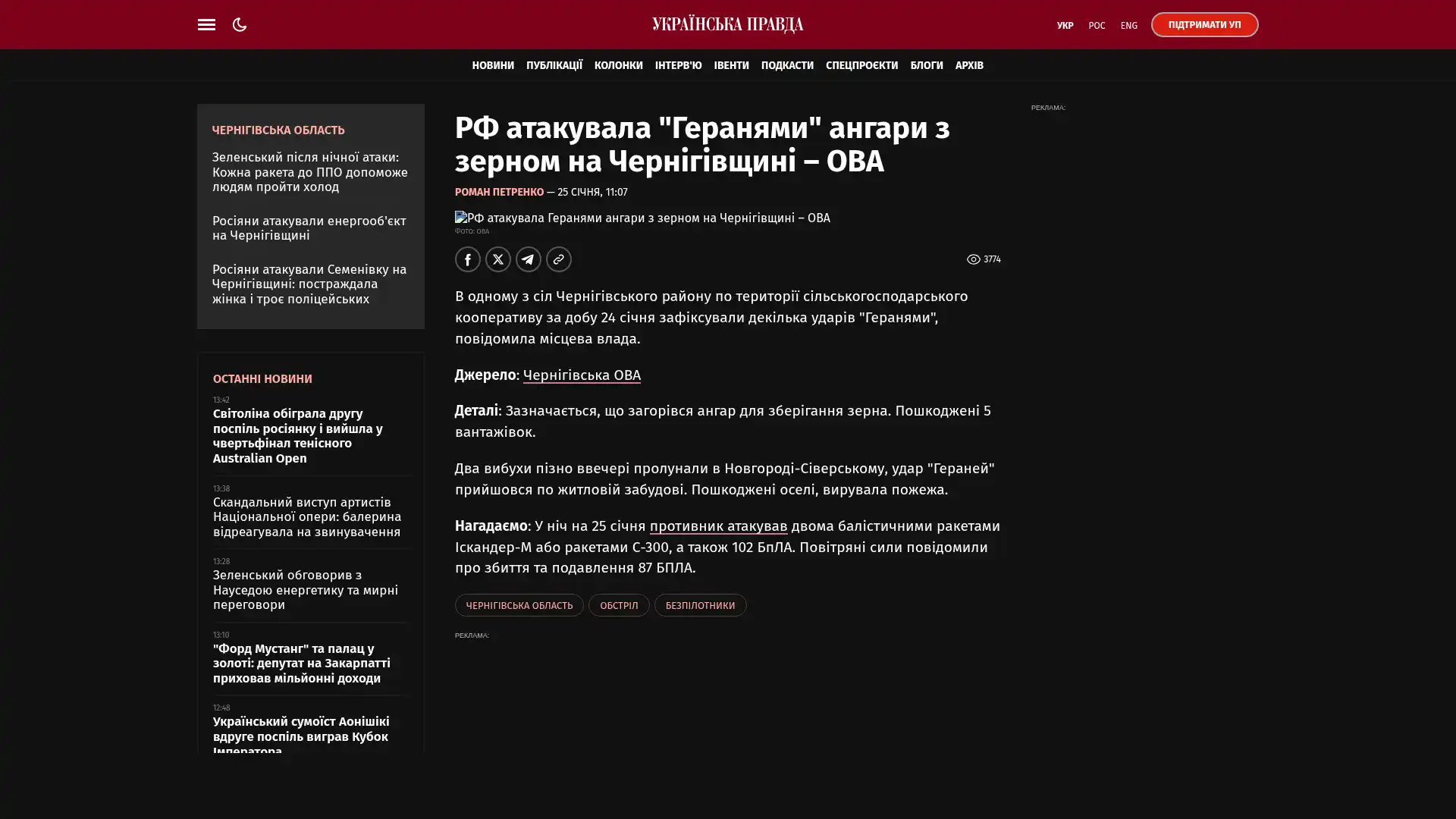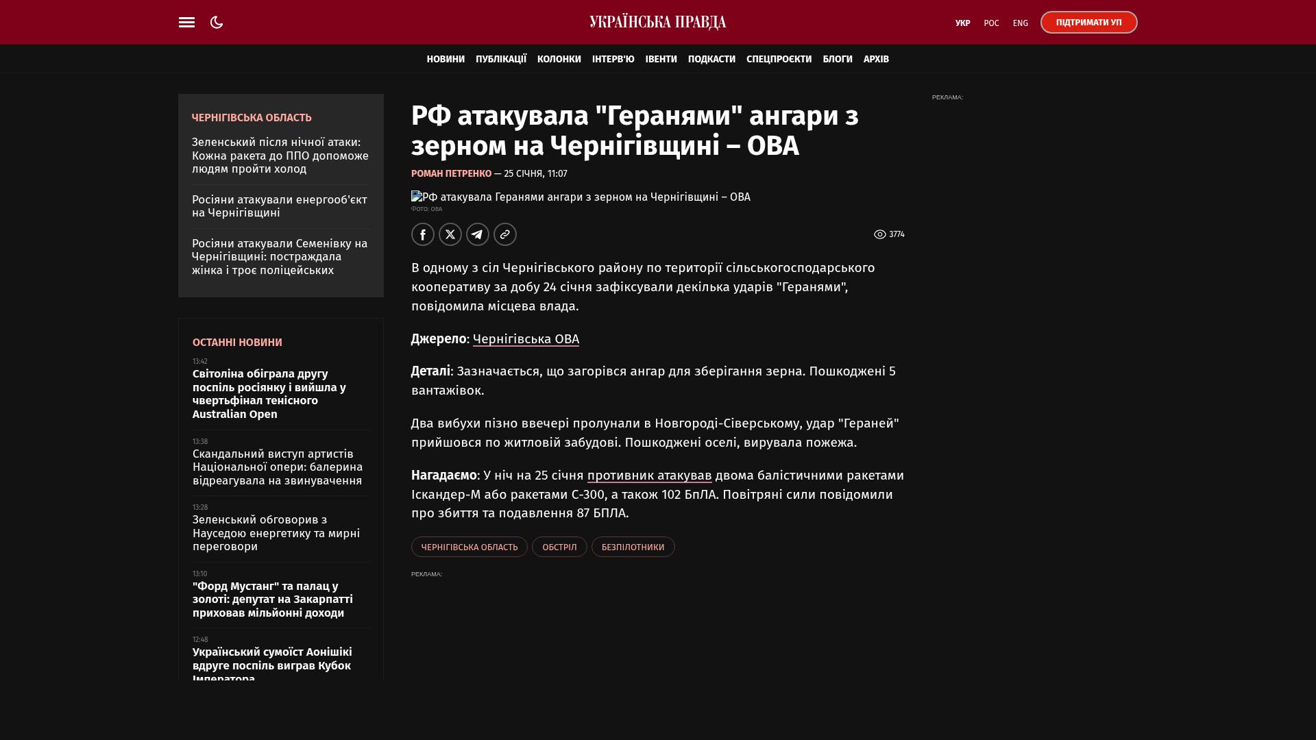 In einem der Dörfer des Bezirks Tschernihiw wurden im Laufe des 24. Januar auf dem Gelände einer landwirtschaftlichen Genossenschaft mehrere Angriffe mit Geranien verzeichnet, so die örtlichen Behörden.