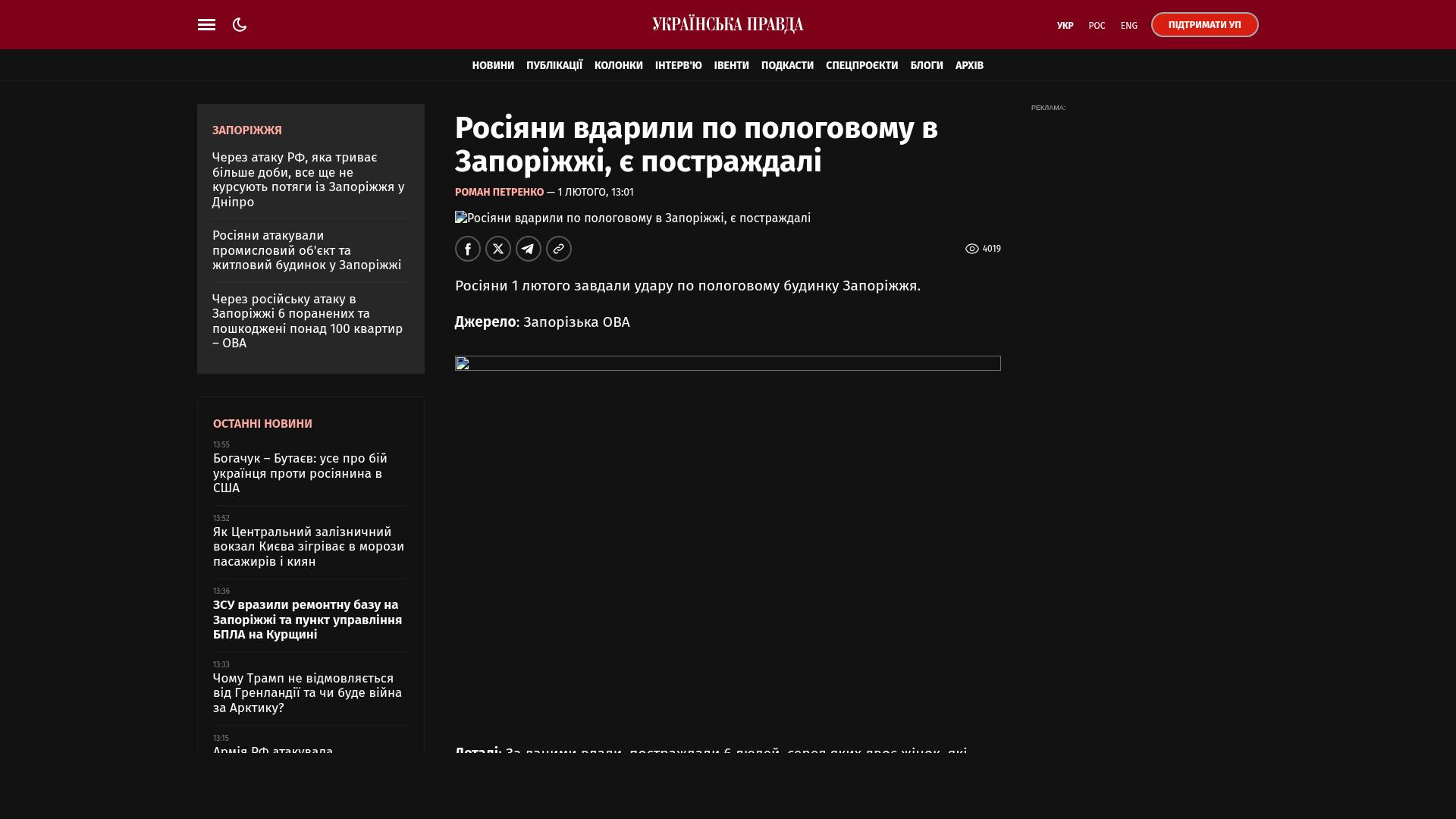 Am 1. Februar haben russische Streitkräfte einen Angriff auf eine Entbindungsklinik in Saporischschja durchgeführt.