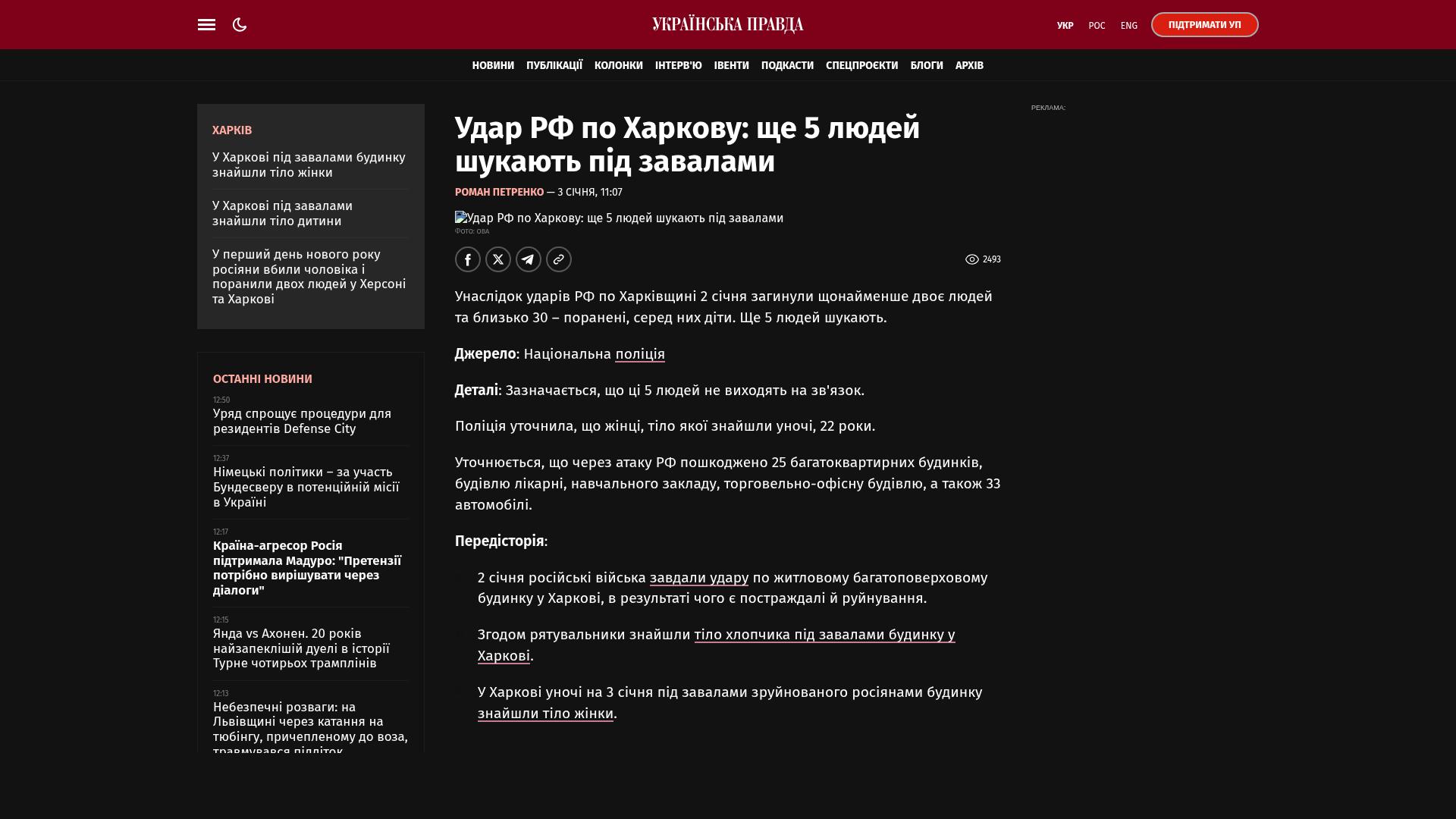 Bei den russischen Angriffen in der Region Charkiw am 2. Januar wurden mindestens zwei Menschen getötet und etwa 30 verletzt, darunter auch Kinder. Nach weiteren 5 Personen wird noch gesucht.