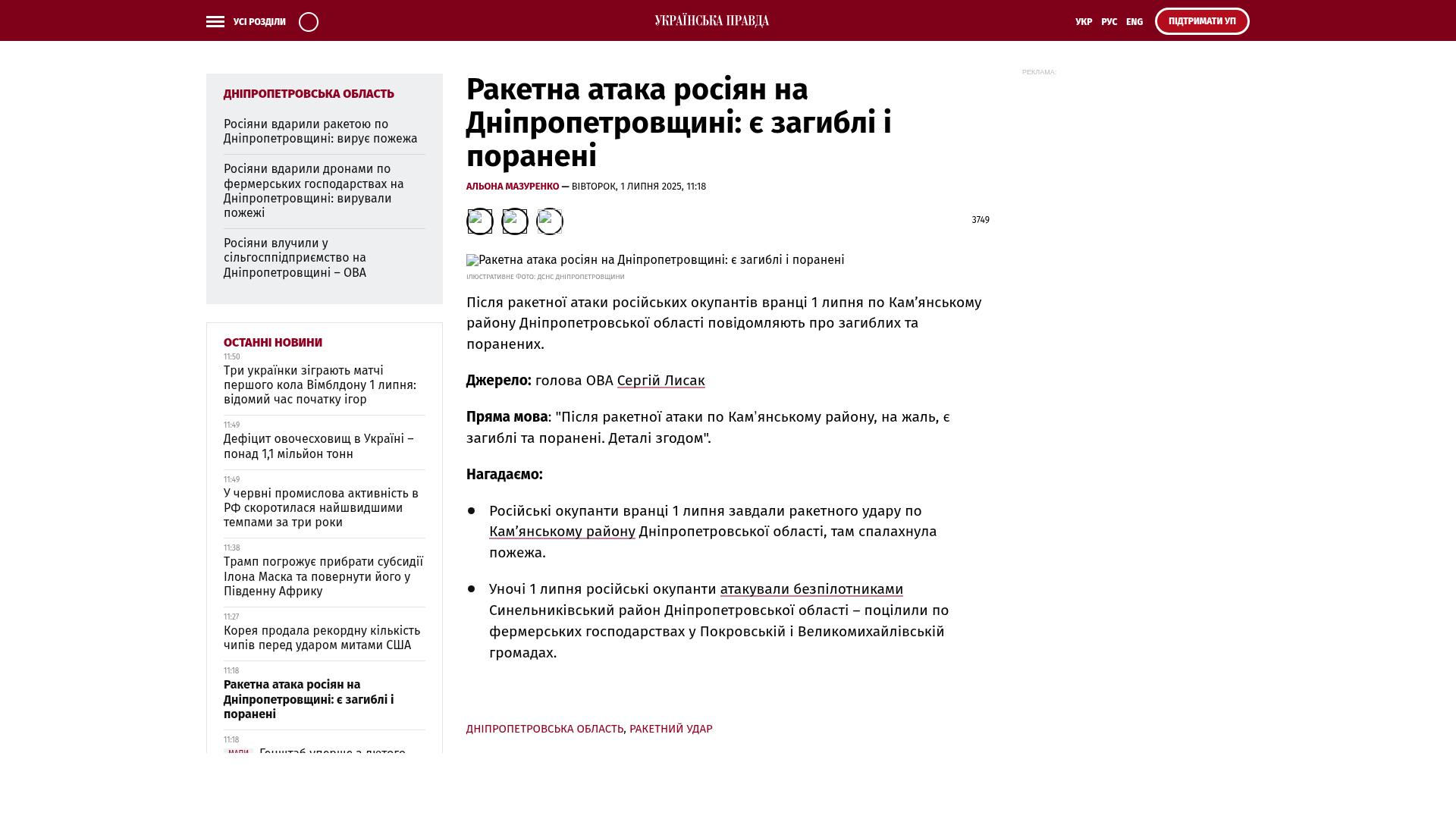 Nach einem Raketenangriff russischer Invasoren am Morgen des 1. Juli auf den Bezirk Kamianskyj in der Region Dnipro gibt es Tote und Verletzte.
