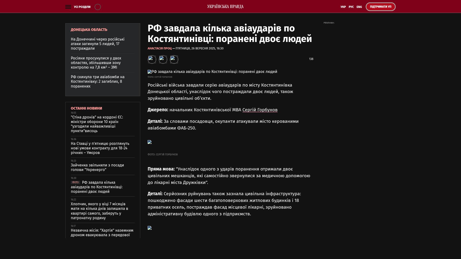 Russische Truppen haben eine Reihe von Luftangriffen auf die Stadt Kostyantynivka in der Region Donezk durchgeführt. Dabei wurden zwei Menschen verletzt und zivile Objekte zerstört.