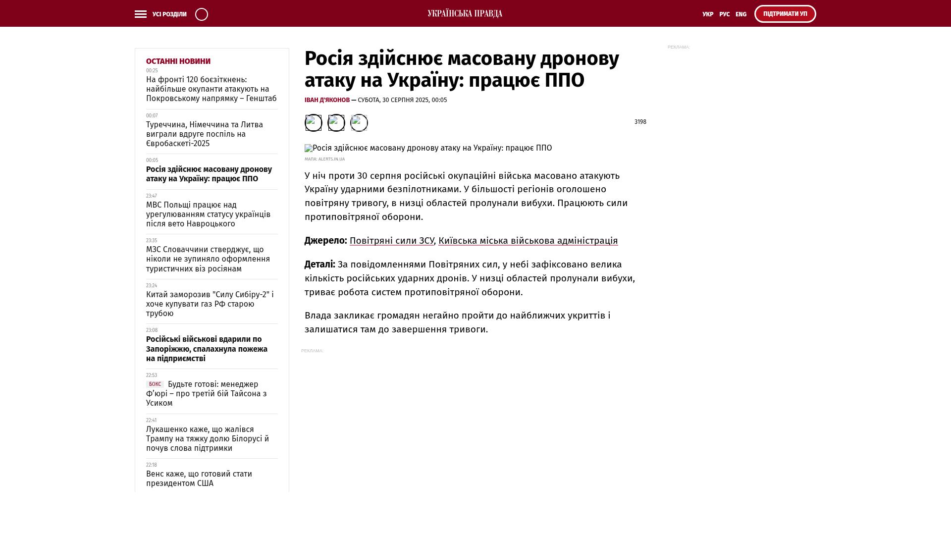 In der Nacht zum 30. August haben die russischen Besatzungstruppen die Ukraine massiv mit Angriffsdrohnen angegriffen. In den meisten Regionen wurde Luftalarm ausgerufen, und in einer Reihe von Gebieten waren Explosionen zu hören. Die Luftabwehrkräfte sind im Einsatz.