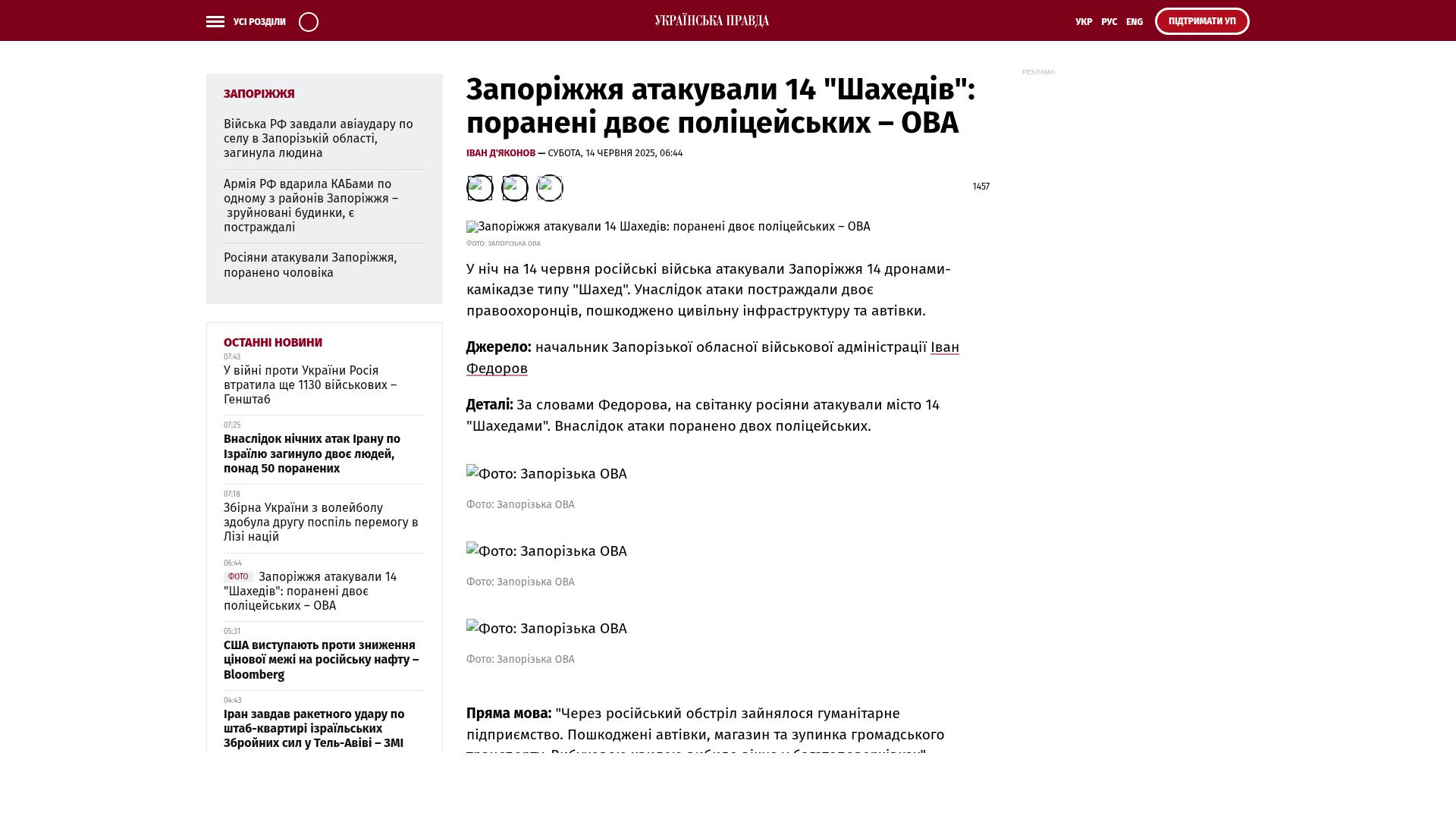 In der Nacht zum 14. Juni haben russische Truppen Saporischschja mit 14 Schahed-Kamikaze-Drohnen angegriffen. Bei dem Angriff wurden zwei Polizeibeamte verletzt und zivile Infrastruktur und Fahrzeuge beschädigt.