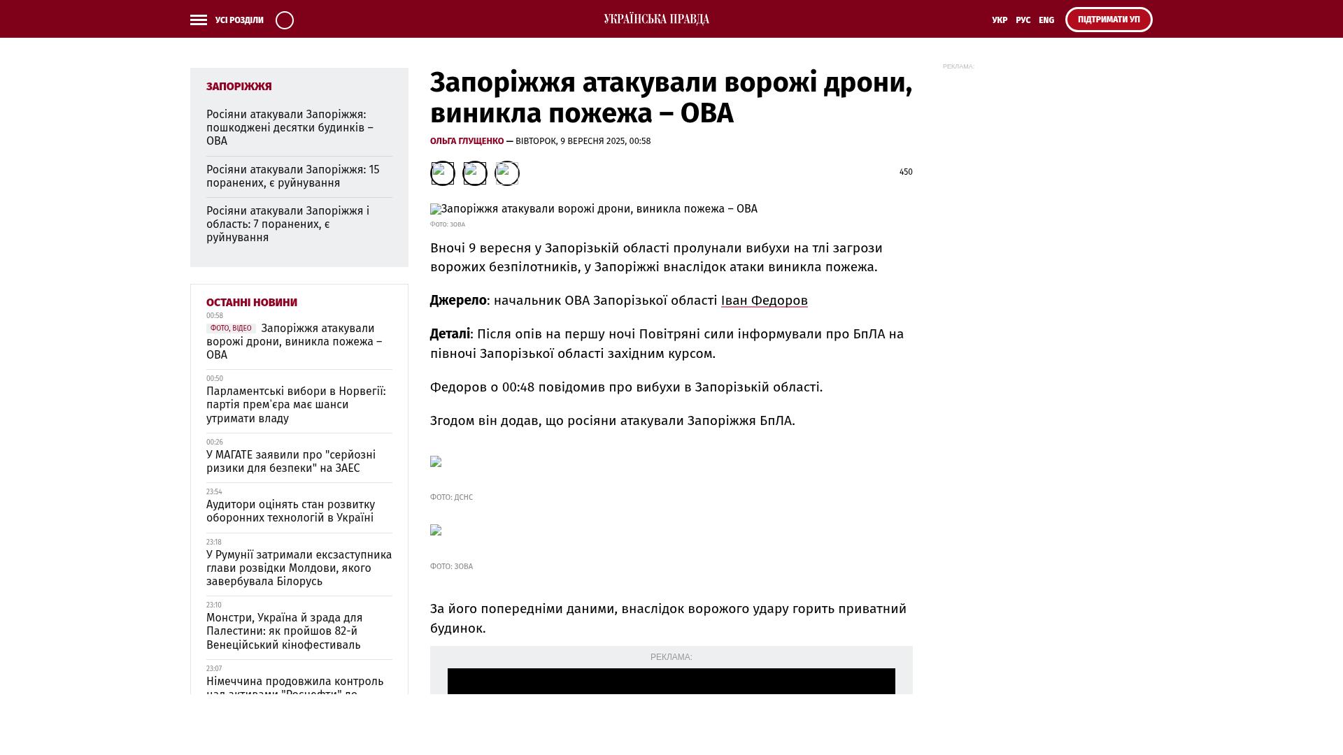 In der Nacht zum 9. September waren in der Region Saporischschja Explosionen zu hören, die durch feindliche Drohnen ausgelöst wurden. Als Folge des Angriffs brach in Saporischschja ein Feuer aus.