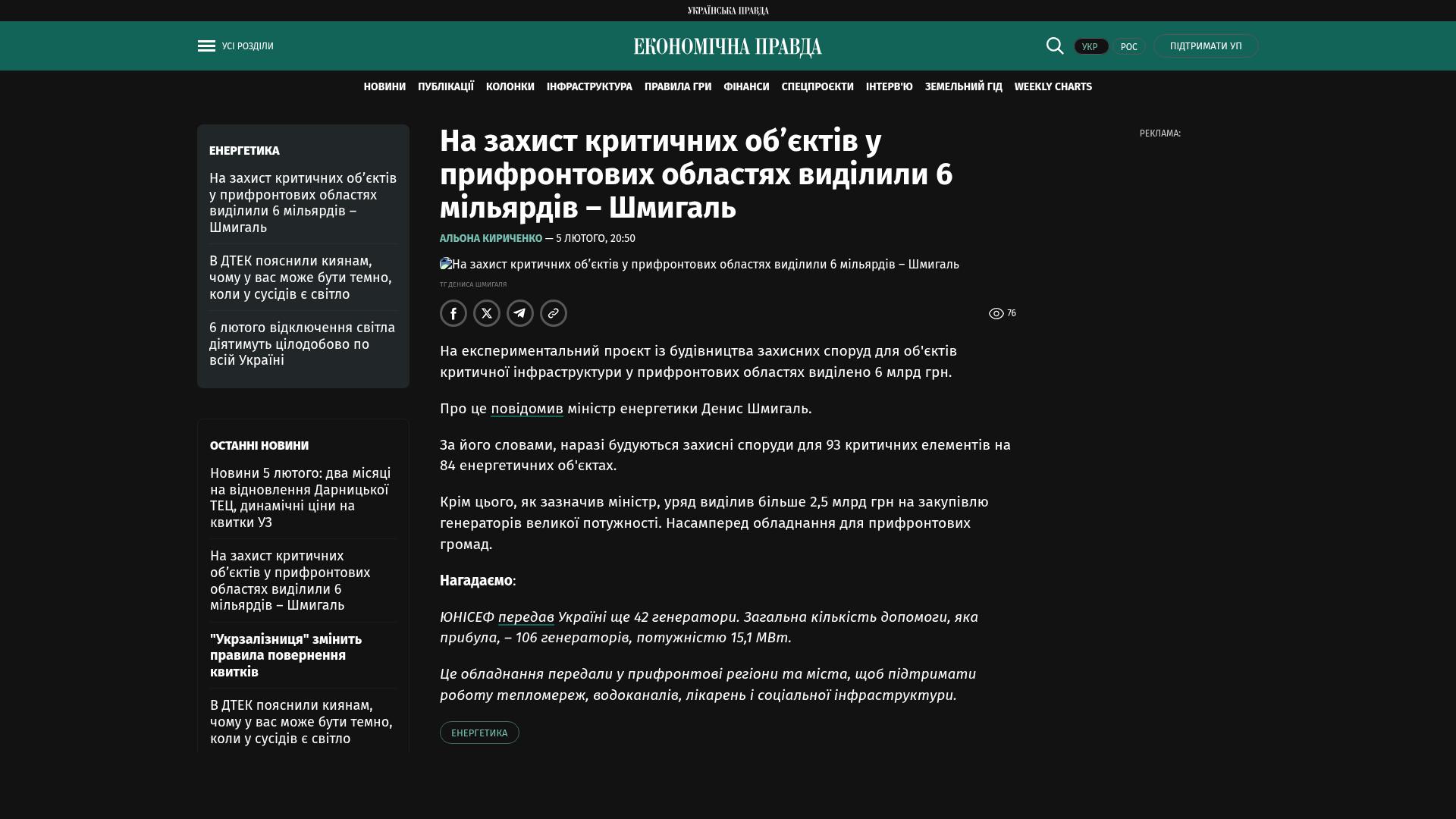 Für ein Pilotprojekt zum Bau von Schutzanlagen für kritische Infrastruktureinrichtungen in Frontgebieten wurden 6 Milliarden Hrywnja bereitgestellt.