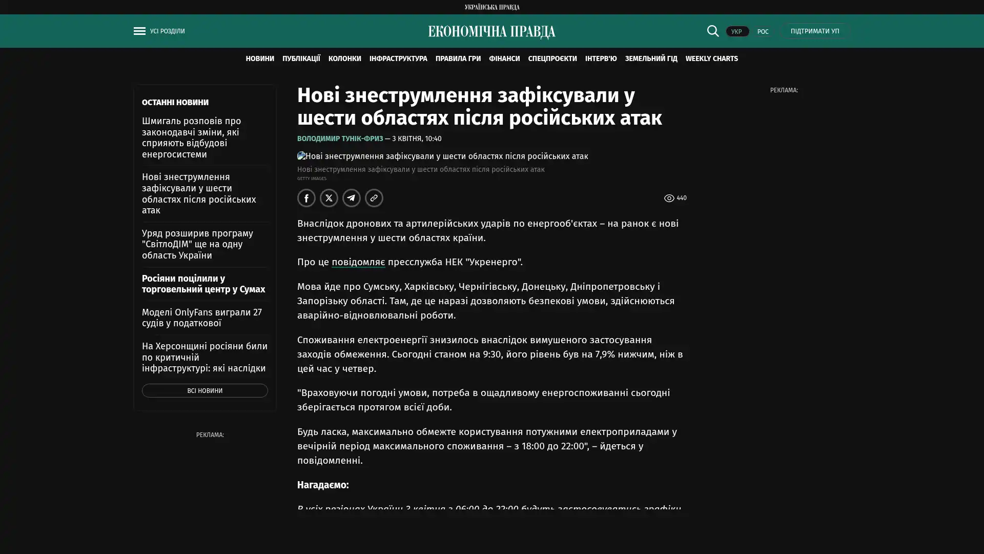 Infolge von Drohnen- und Artillerieangriffen auf Energieinfrastrukturen kam es am Morgen zu neuen Stromausfällen in sechs Regionen des Landes.