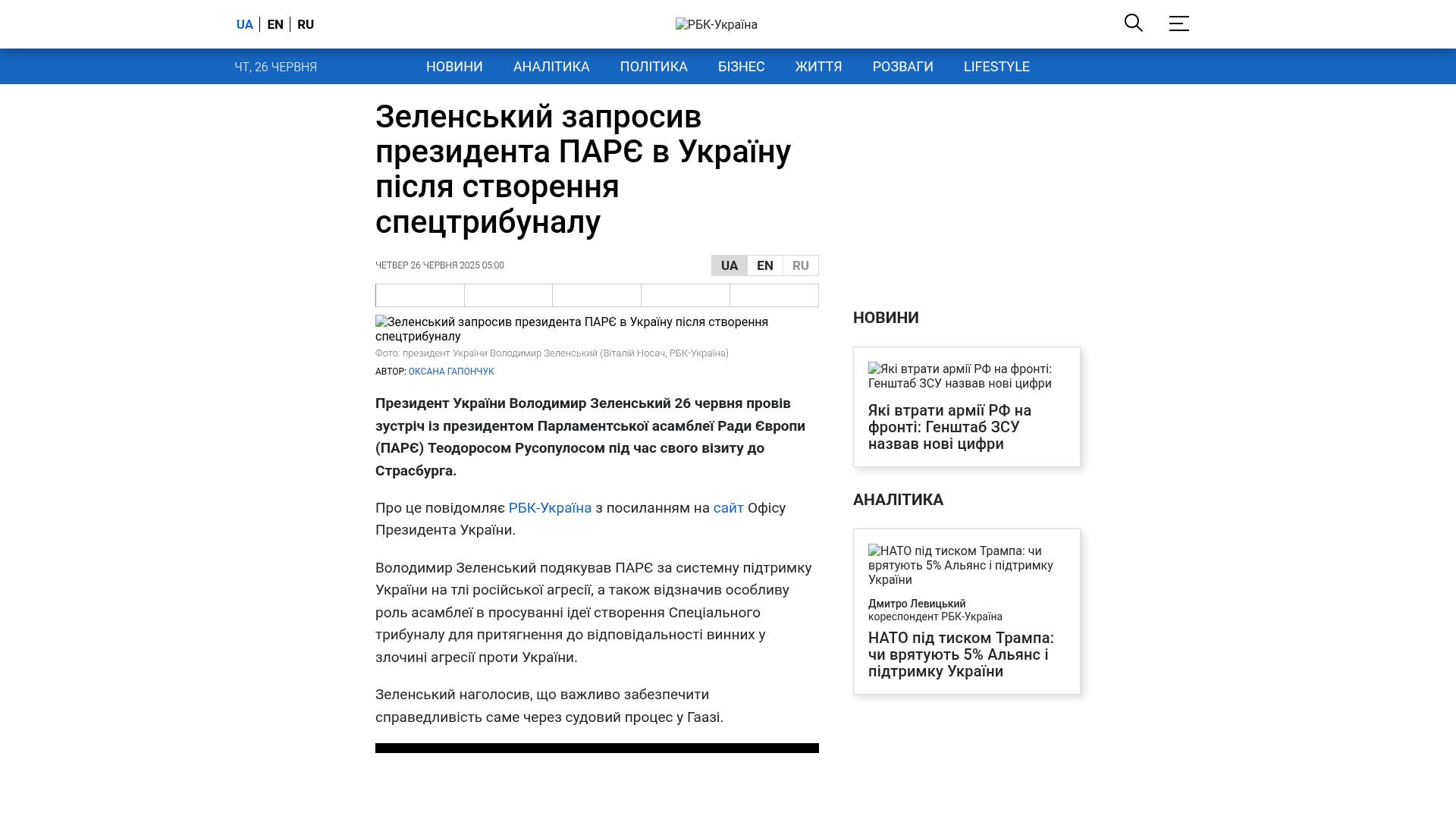 Am 26. Juni traf sich der ukrainische Präsident Wolodymyr Selenskyj mit dem Präsidenten der Parlamentarischen Versammlung des Europarats (PACE) Theodoros Rouxopoulos während seines Besuchs in Straßburg.