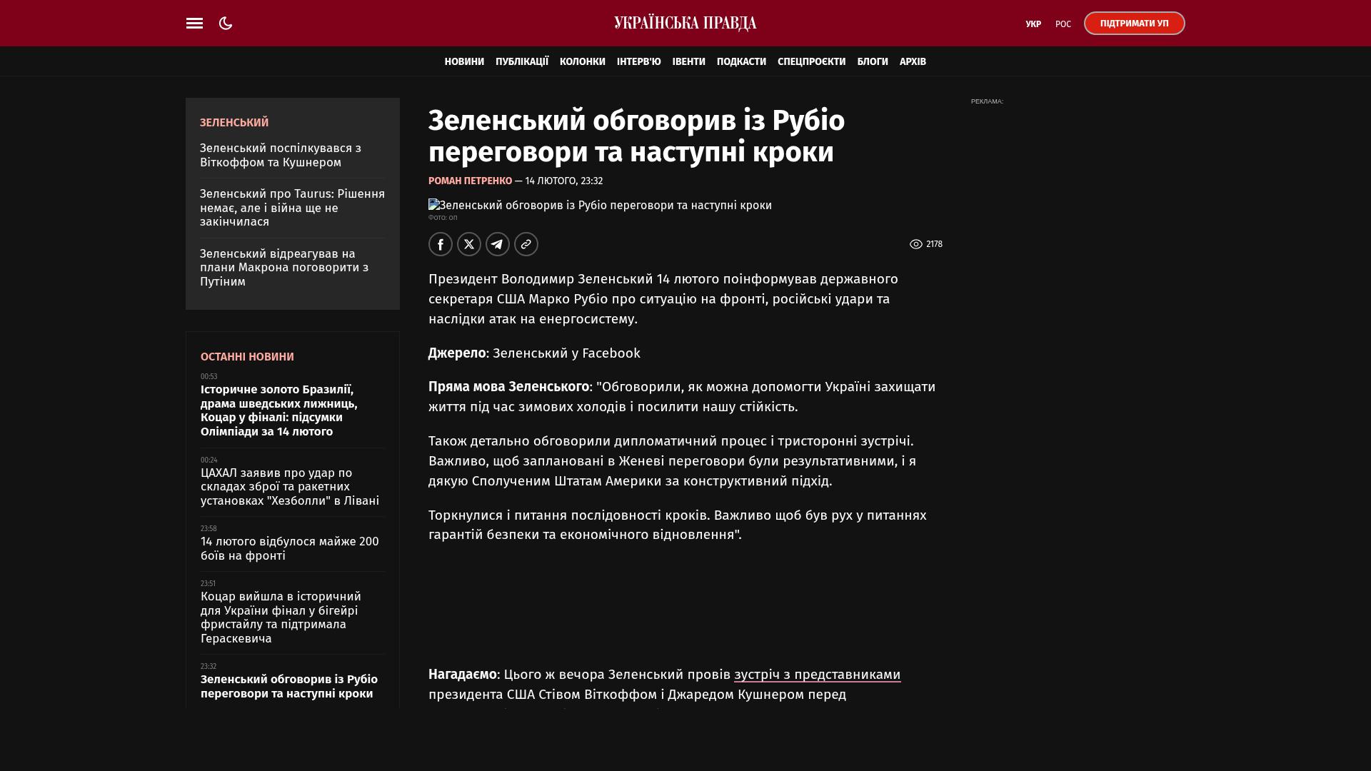 Präsident Wolodymyr Selenskyj informierte am 14. Februar den US-Außenminister Marco Rubio über die Lage an der Front, die russischen Angriffe und die Folgen der Angriffe auf das Energiesystem.